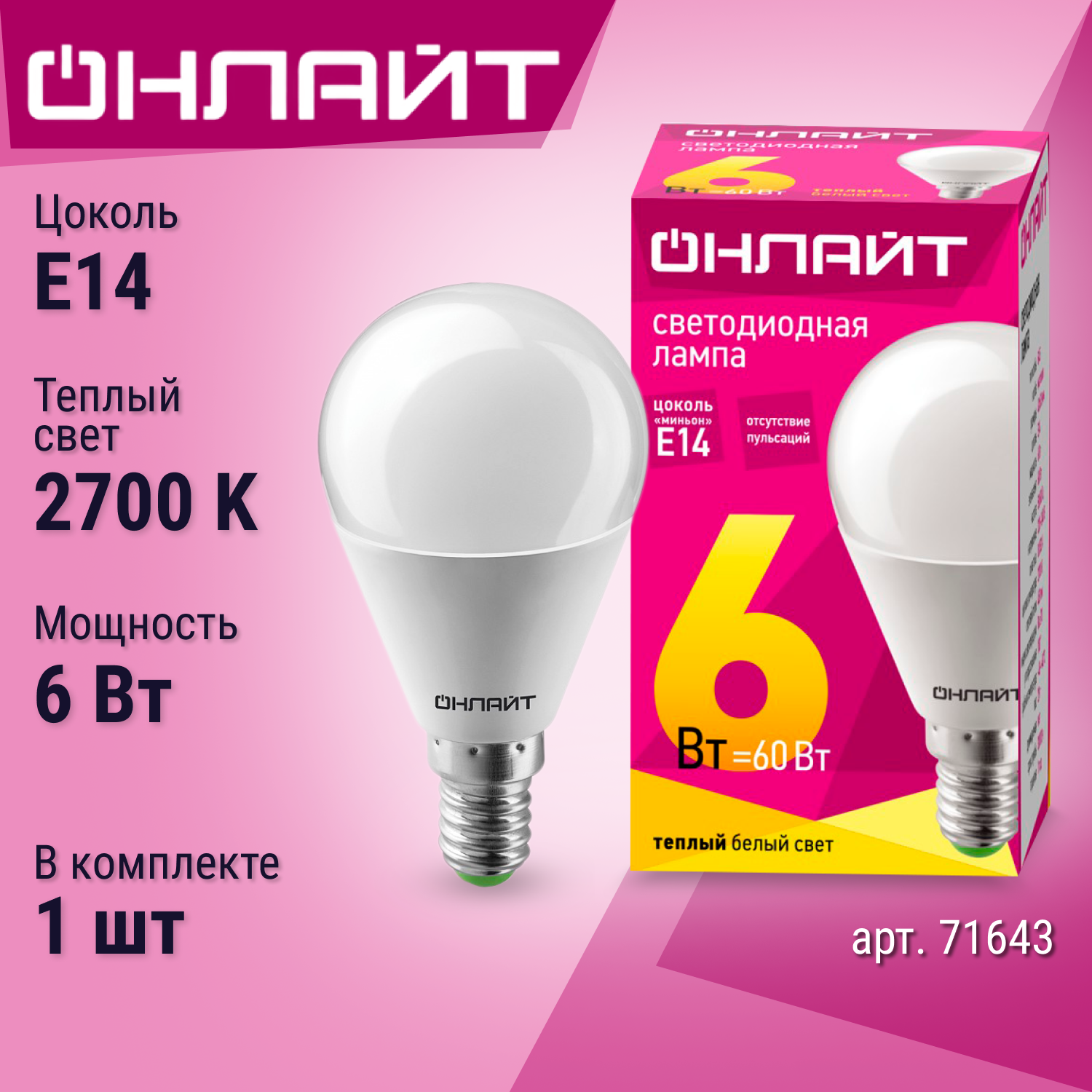 Лампа светодиодная онлайт 71643, E14, G45, 6 Вт, 2700 К