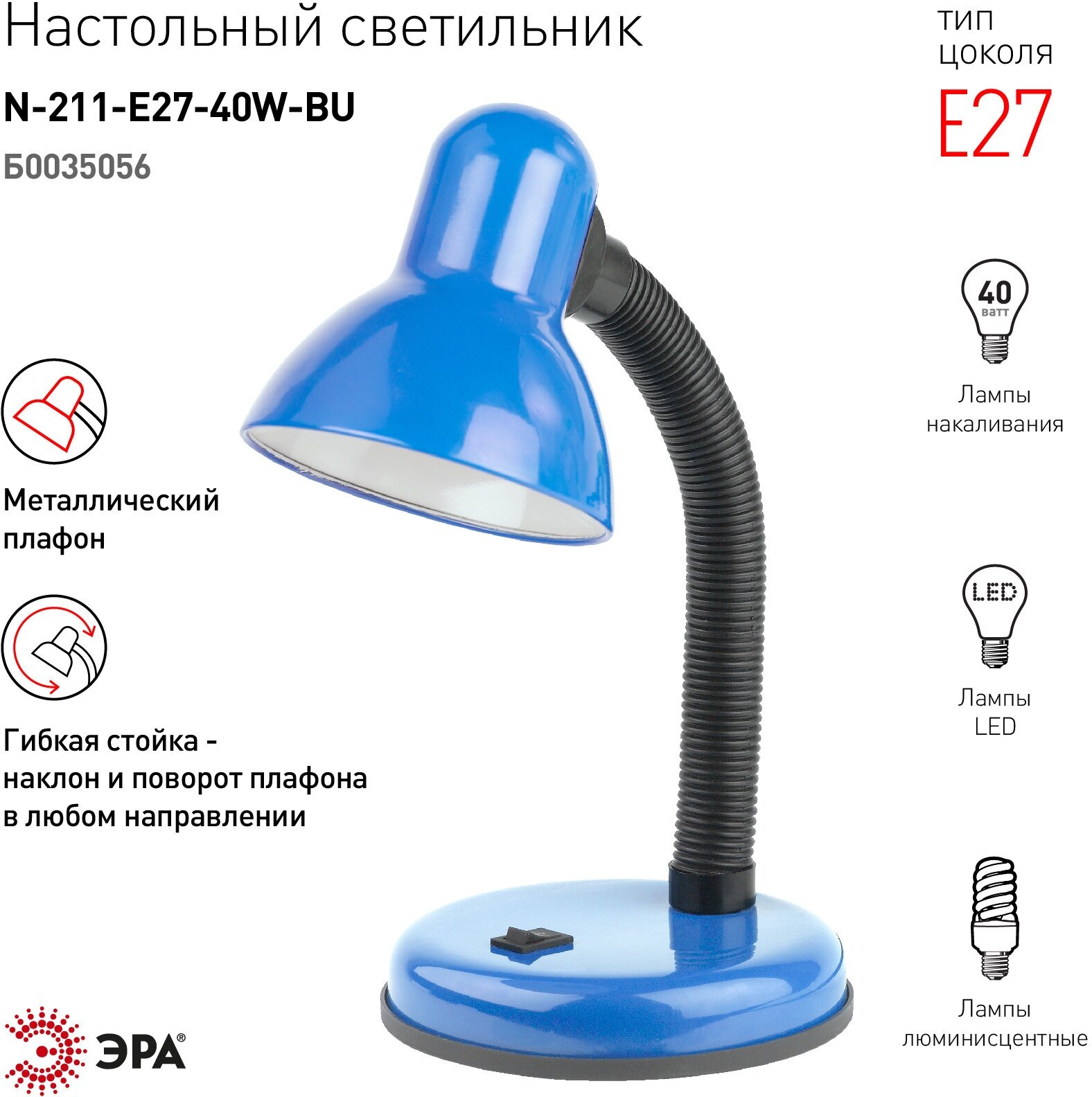 СохранитьНастольный светильник ЭРА N-211-E27-40W-BU синий Б0035056 интересное: