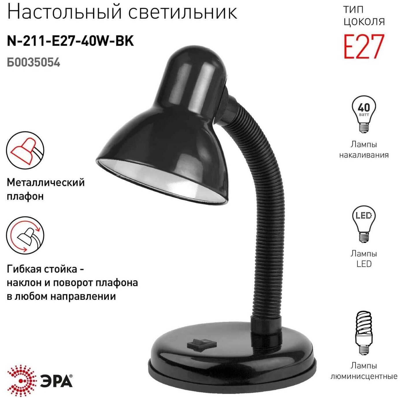 Купить ЭРА N-211 св-к настольный на основании 40W E27 металл/пластик, черный N-211-E27-40W-BK (пакет) 7778