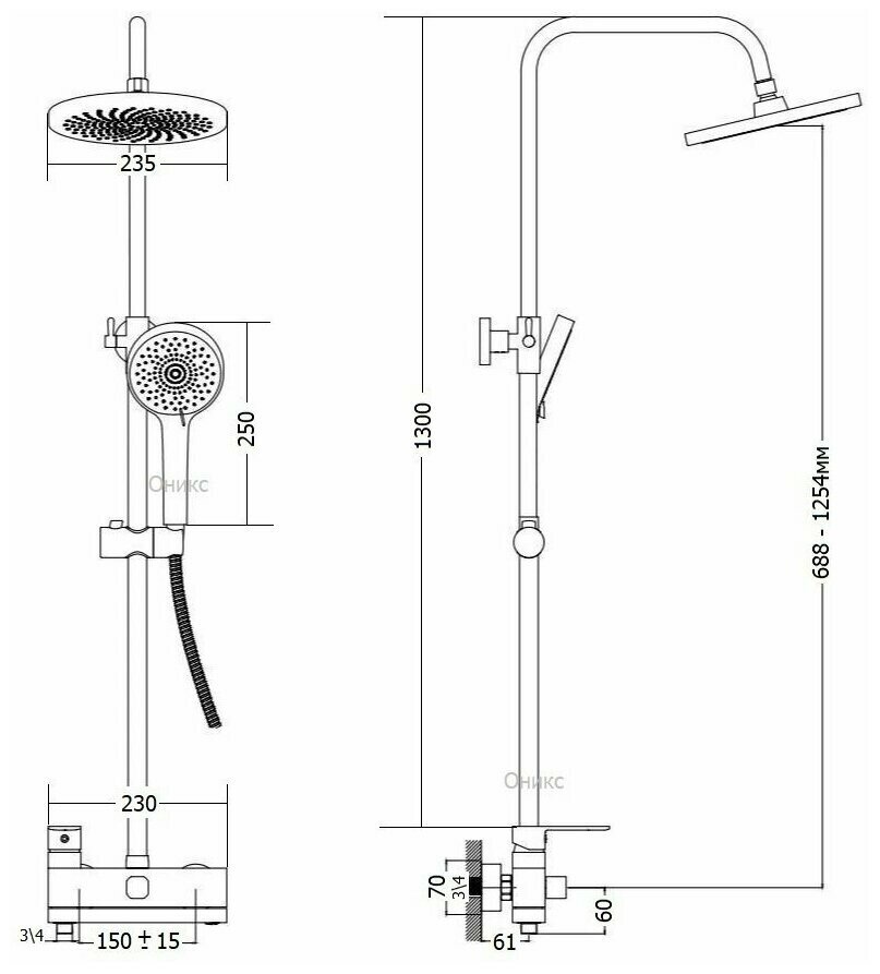 | Комплектация | смеситель с изливом / душевая стойка / тропический душ / кронштейн для верхнего душа / держатель лейки / душевая лейка 2 режима / душевой шланг 1,5м. / эксцентрики 2шт. |