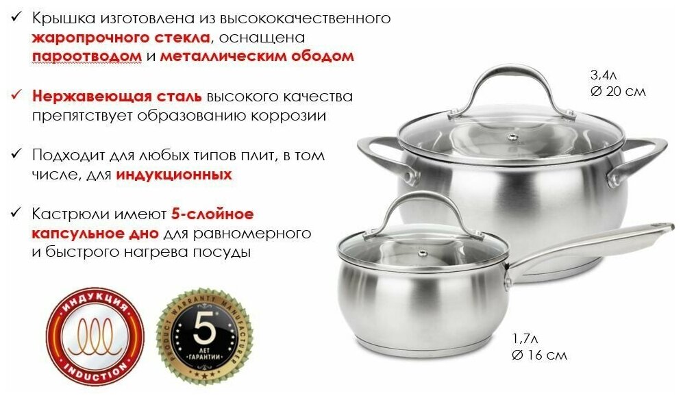 СохранитьНабор кастрюль ATTRIBUTE из нержавеющей стали для индукционных плит / кастрюля с крышкой 3.4 л + ковш с крышкой 1.7 л интересное: