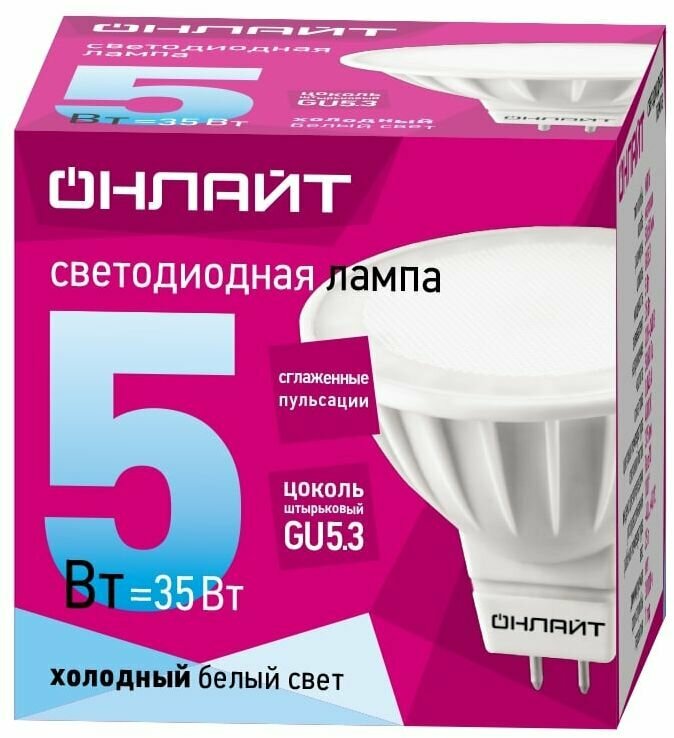 Лампа светодиодная LED Онлайт, GU5.3, MR16, 5 Вт, 4000 K, холодный свет