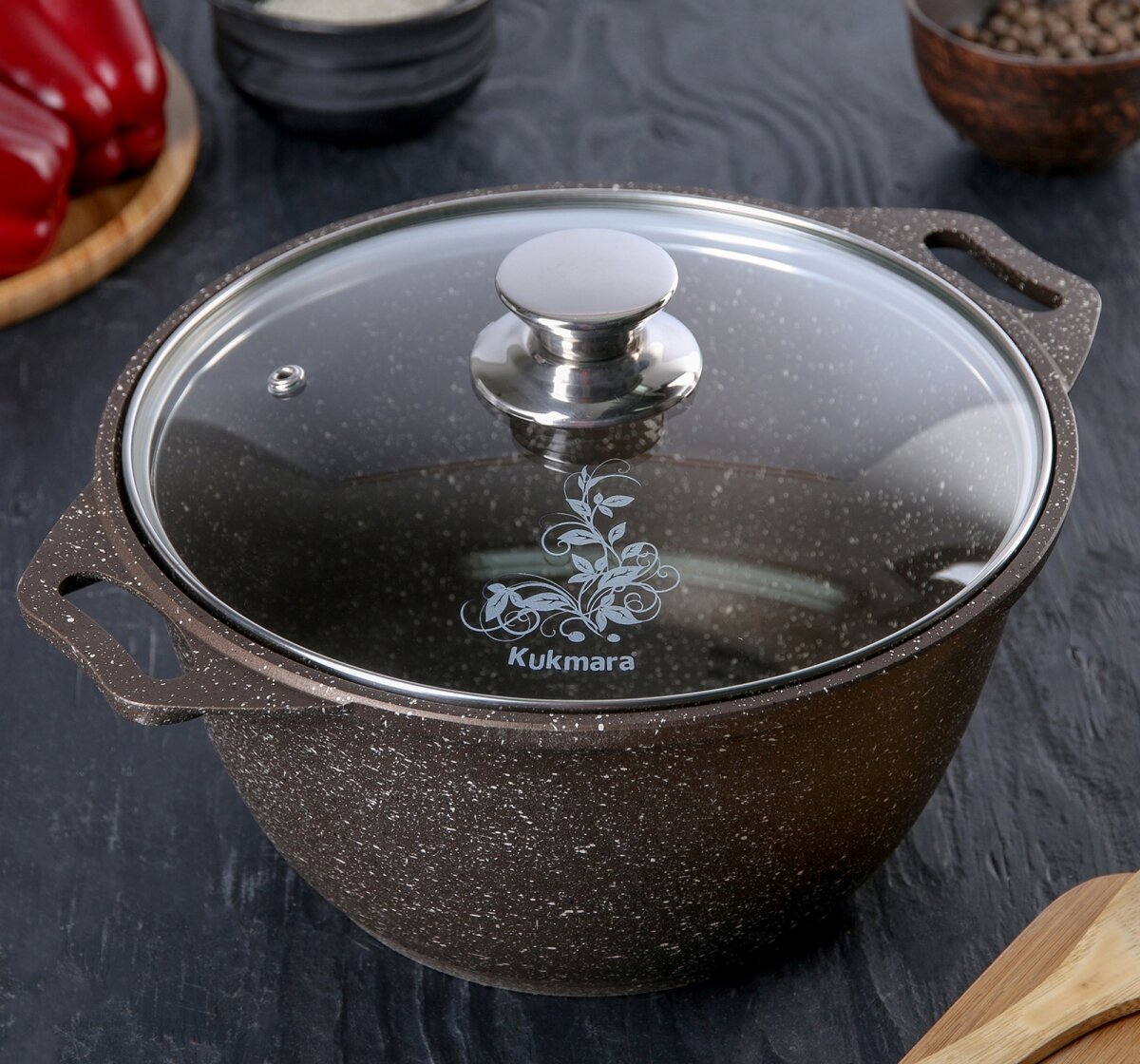 Кастрюля Kukmara 4 л индукция, покрытие Мрамор кофейный, литой алюминий, со стеклянной крышкой 24см, кмки42а