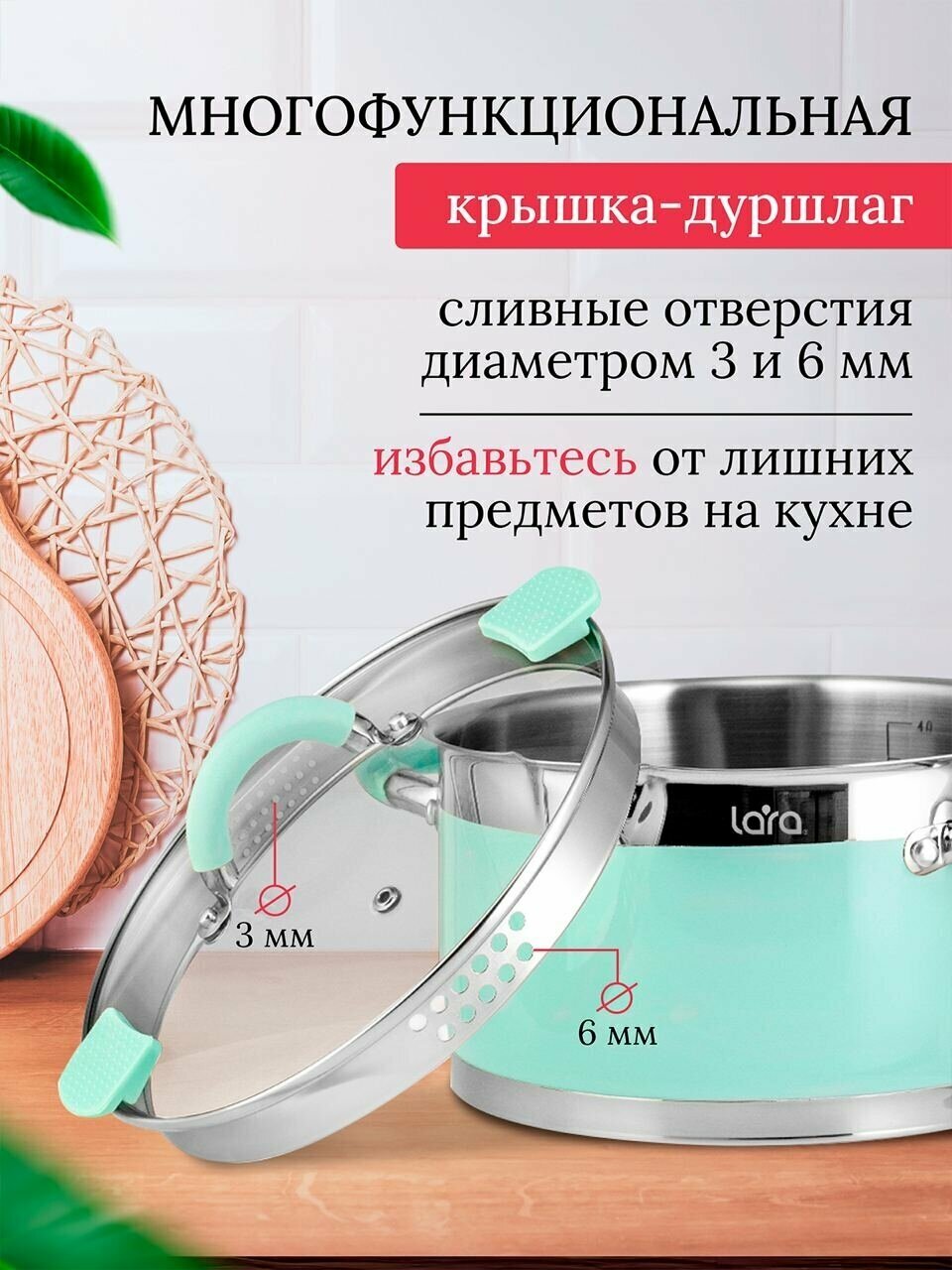 Кастрюля LARA LR02-543 MINT, 4,4л, d22 см, с крышкой дуршлаг, для всех видов плит