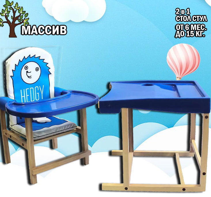 Купить Стол стул Трансформер бэби ежик синий из массива, лак для кормления, отдыха, развития