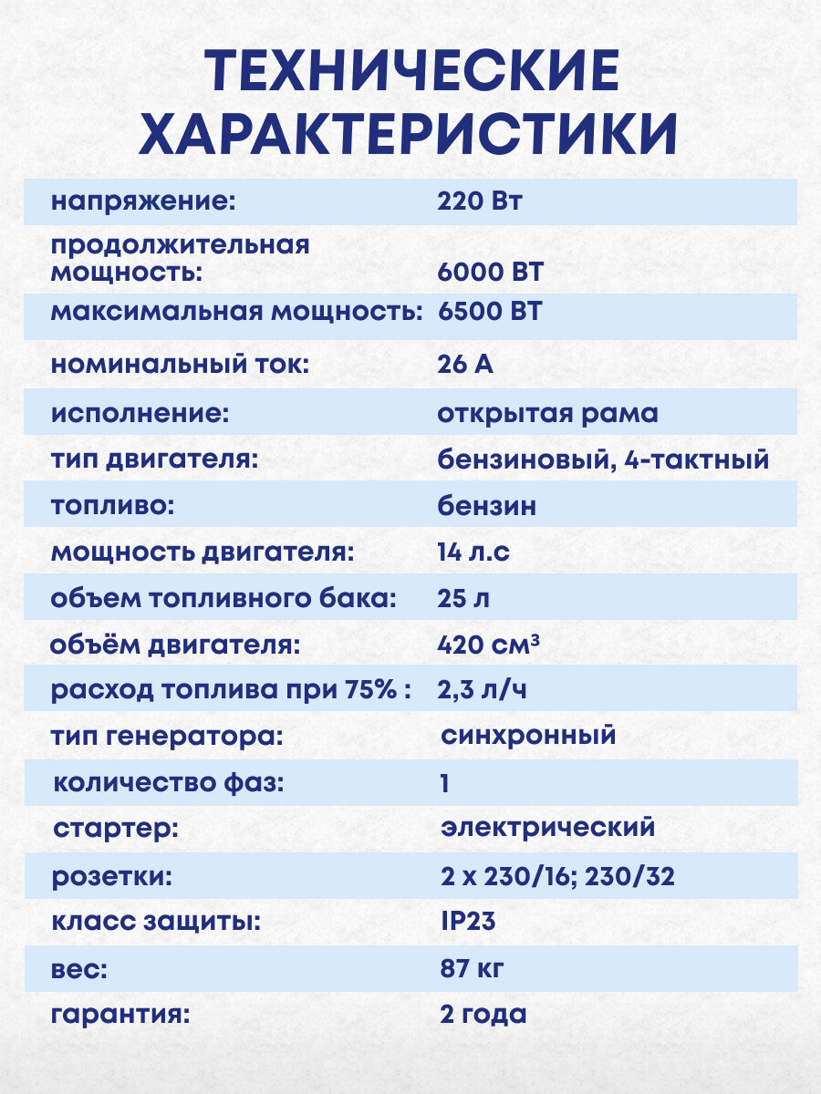 | Дополнительная информация | цифровой дисплей, усиленная рама; коэффициент мощности 1; расход топлива при нагрузке 75% и температуре окружающей среды 20 град. - 2,3 л/ч |