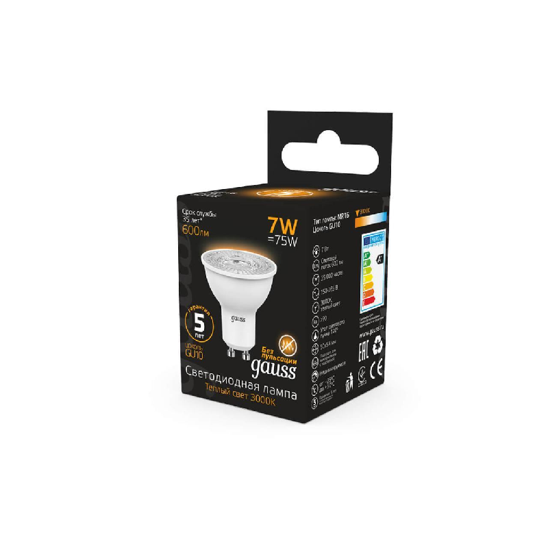 Упаковка светодиодных ламп 10 шт. gauss 101506107 3000K, GU10, MR16, 7Вт, 3000 К