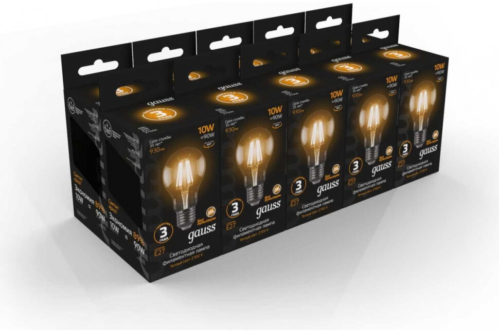 (5 шт)Лампа Gauss Filament А60 10W 930lm 2700К Е27 LED 1/10/40