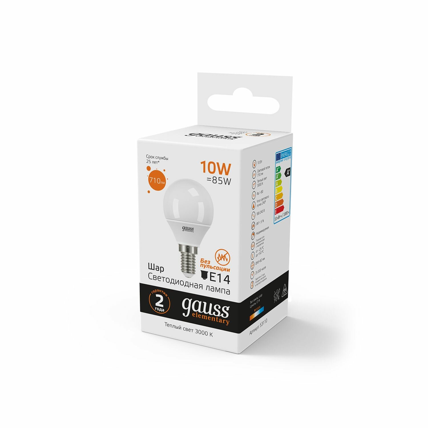 Лампочка светодиодная E14 Шар 10W теплый свет 3000K упаковка 10 шт. Gauss Elementary