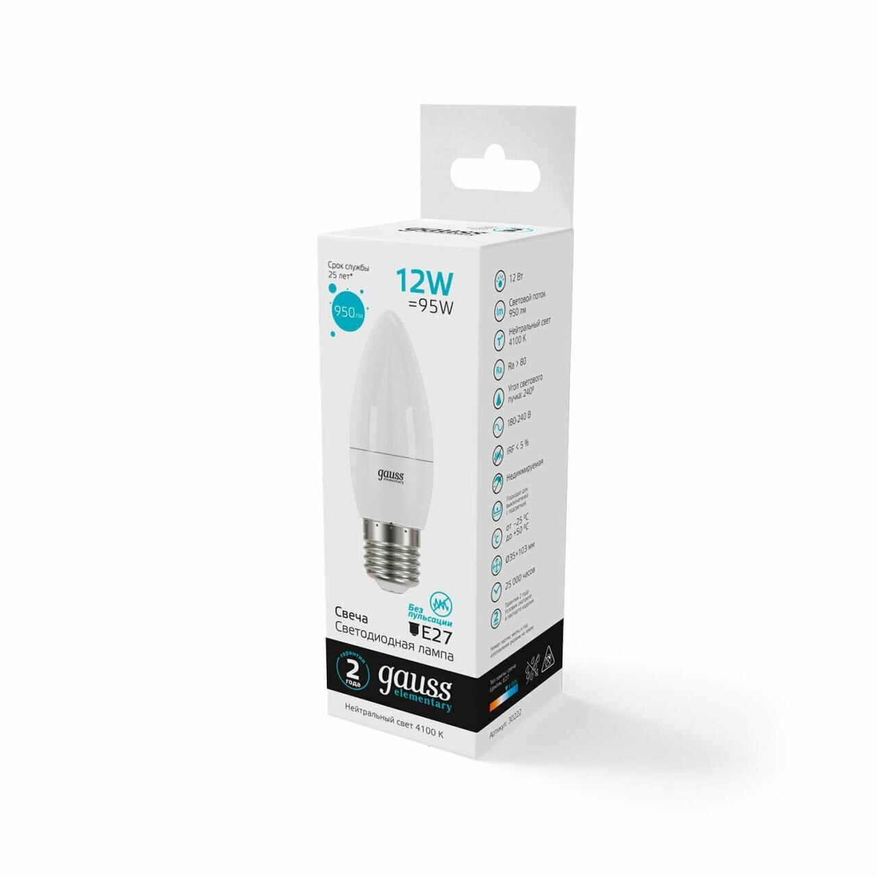 Лампа светодиодная Elementary 12Вт свеча 4100К нейтр. бел. E27 950лм GAUSS 30222 интересное: