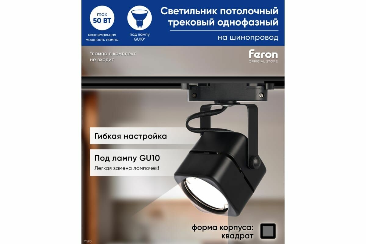 Светильник AL190 трековый однофазный на шинопровод под лампу GU10, черный, FERON 41590 (1 шт.)