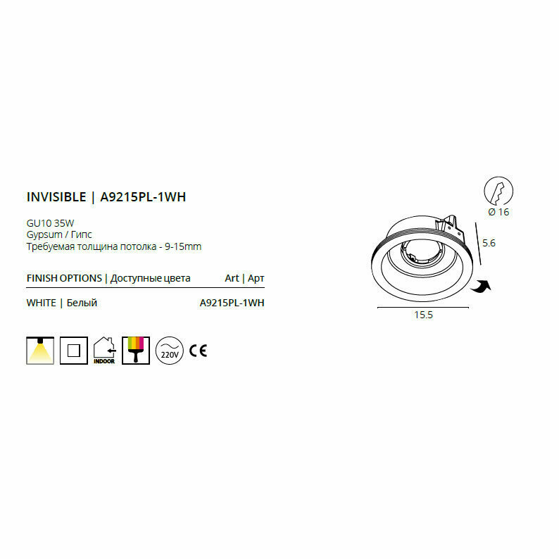 Встраиваемый светильник Arte Lamp INVISIBLE A9215PL-1WH, GU10, 35Вт, кол-во ламп:1шт., Белый
