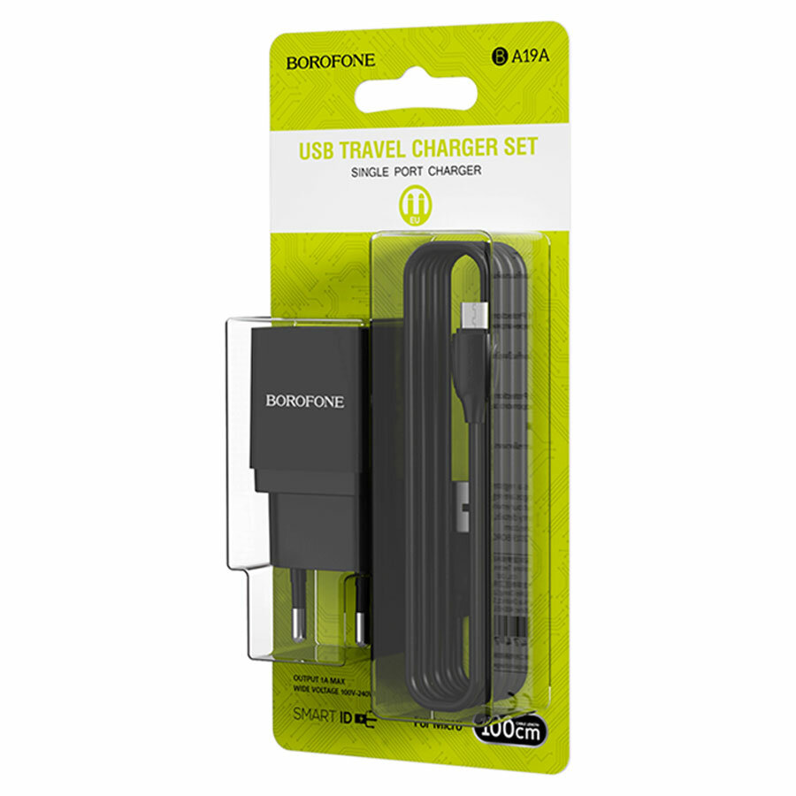 Купить Сетевое зарядное устройство (адаптер) Borofone BA19A, USB Type-A, 1А, 5В, кабель MicroUSB в комплекте, черный