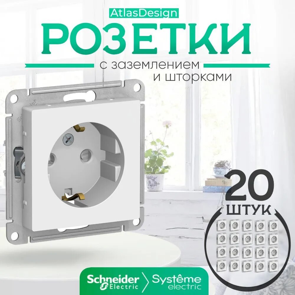 Розетка с заземлением белая с шторками Schneider/Systeme Electric AtlasDesign 16А механизм ATN000145 комплект 20шт.
