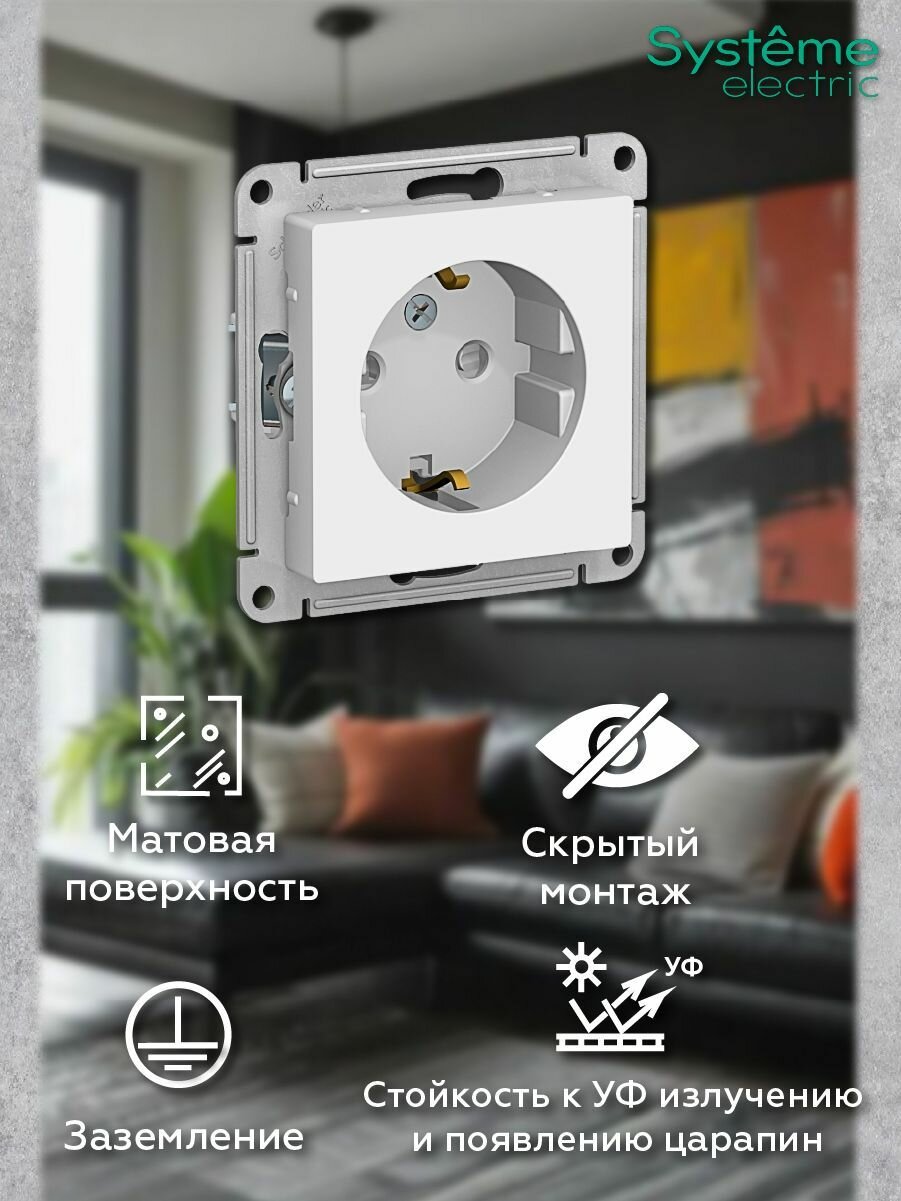 Розетка с заземляющим контактом, со шторками, механизм Монтаж: скрытой установки Цвет: белый Термопласт: антибактериальный, с ионами серебра (Schneider) Systeme Electric AtlasDesign ATN000145 комплект 10шт.