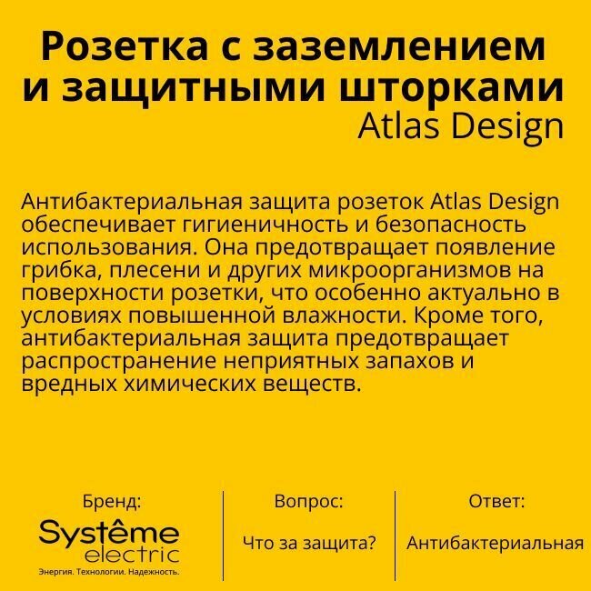 Розетка с заземляющим контактом, со шторками, механизм Монтаж: скрытой установки Цвет: белый Термопласт: антибактериальный, с ионами серебра (Schneider) Systeme Electric AtlasDesign ATN000145 комплект 10шт.