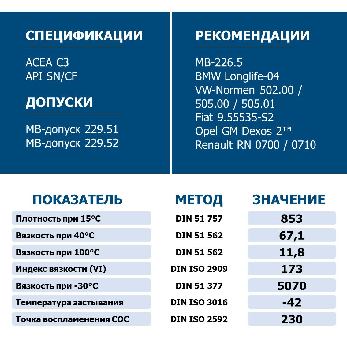 | Допуски OEM | BMW Longlife-04 / GM Dexos 2 / MB 226.5 / MB 229.51 / MB 229.52 / Renault RN 0700 / Renault RN 0710 / VW 502.00/505.00 / VW 505.01 |