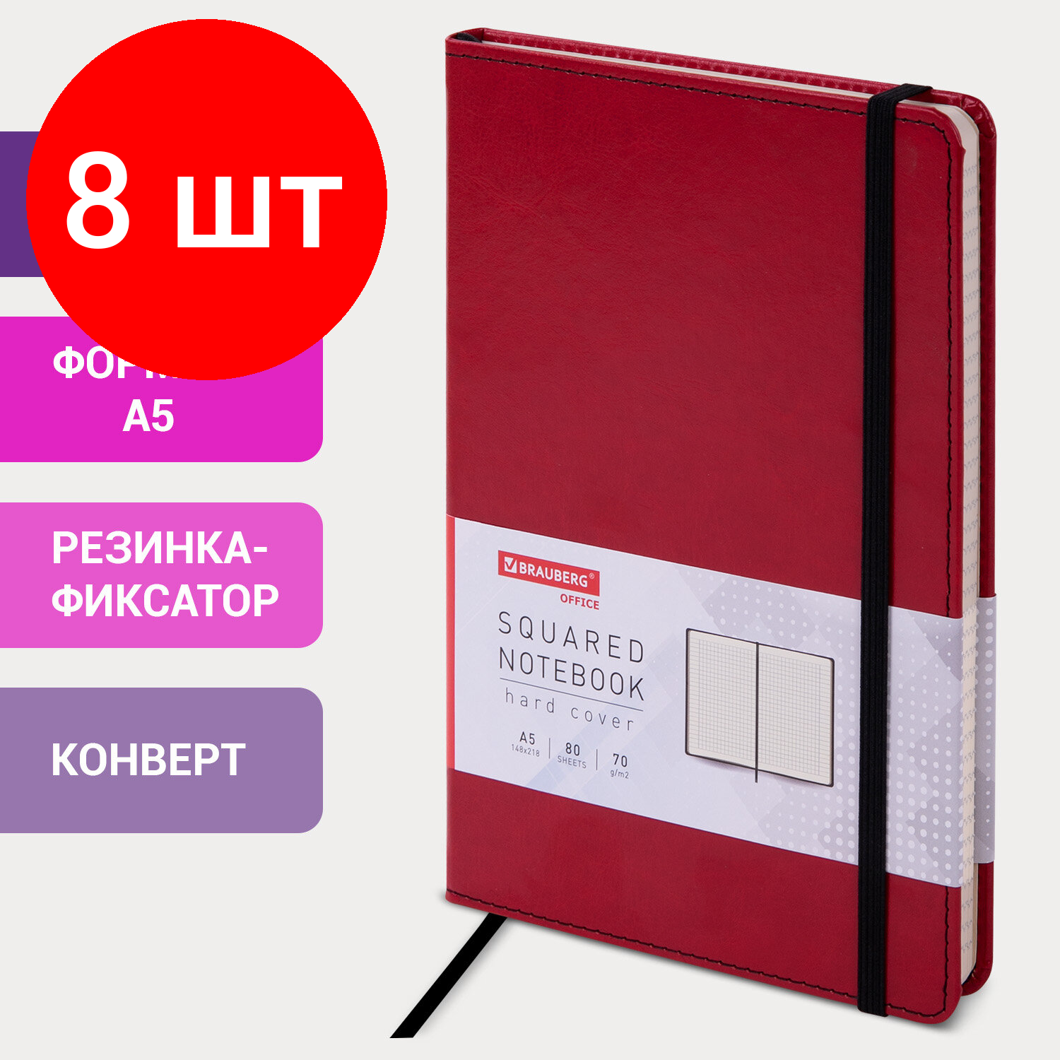 Купить Комплект 8 шт, Блокнот в клетку с резинкой А5 (148x218 мм), 80 л., под кожу красный BRAUBERG "Office", 111030