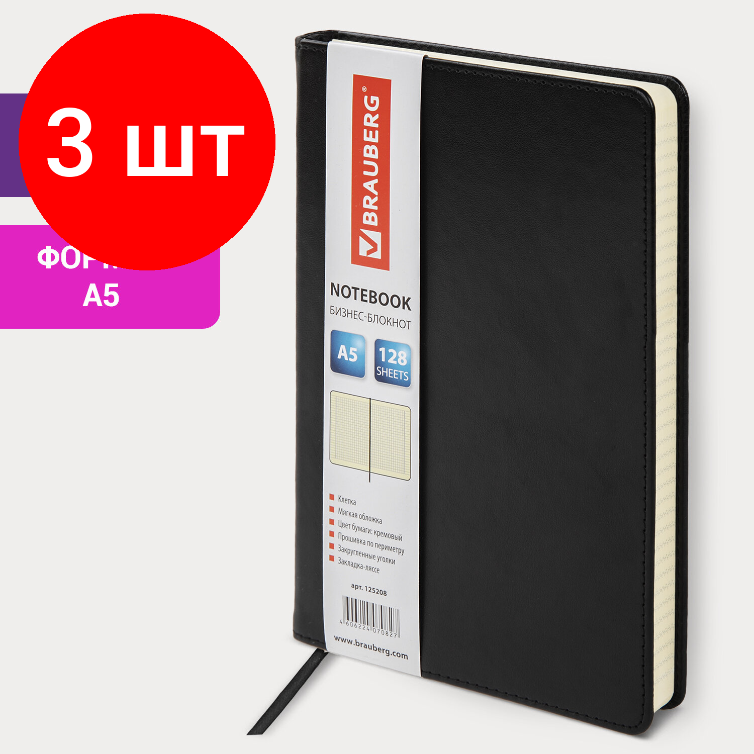 Купить Комплект 3 шт, Блокнот А5 (148х218 мм), BRAUBERG "Income", 128 л., гладкий кожзаменитель, клетка, черный, 125208
