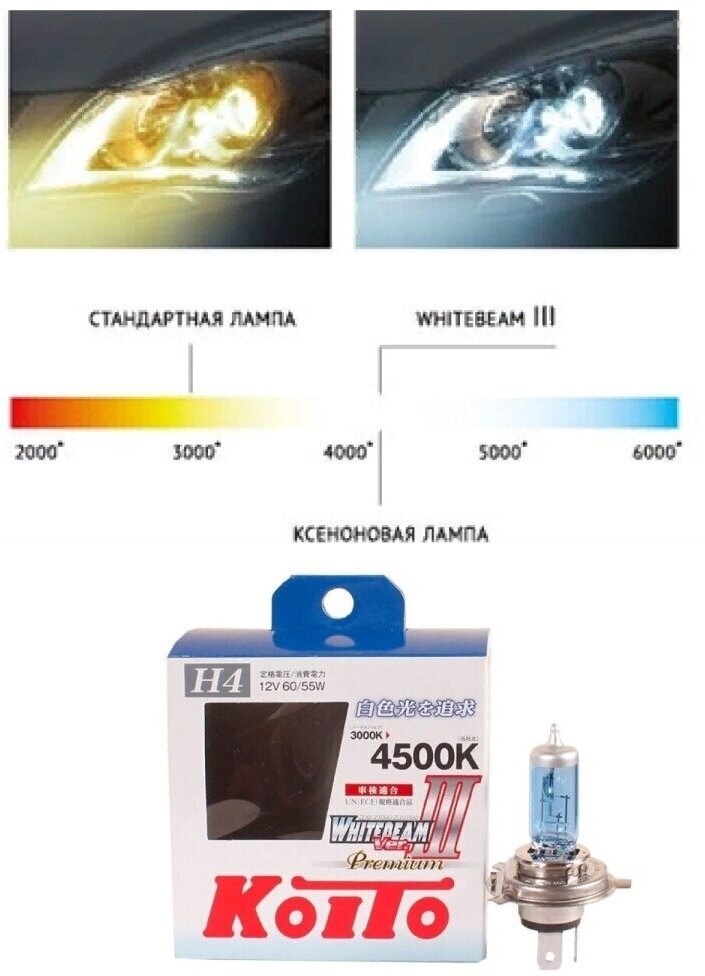 Высокотемпературная лампа KOITO Whitebeam Premium H4, 12 В, 60/55 Вт, 135/125 Вт, 4500 K, комплект 2 шт. P0744W 121021