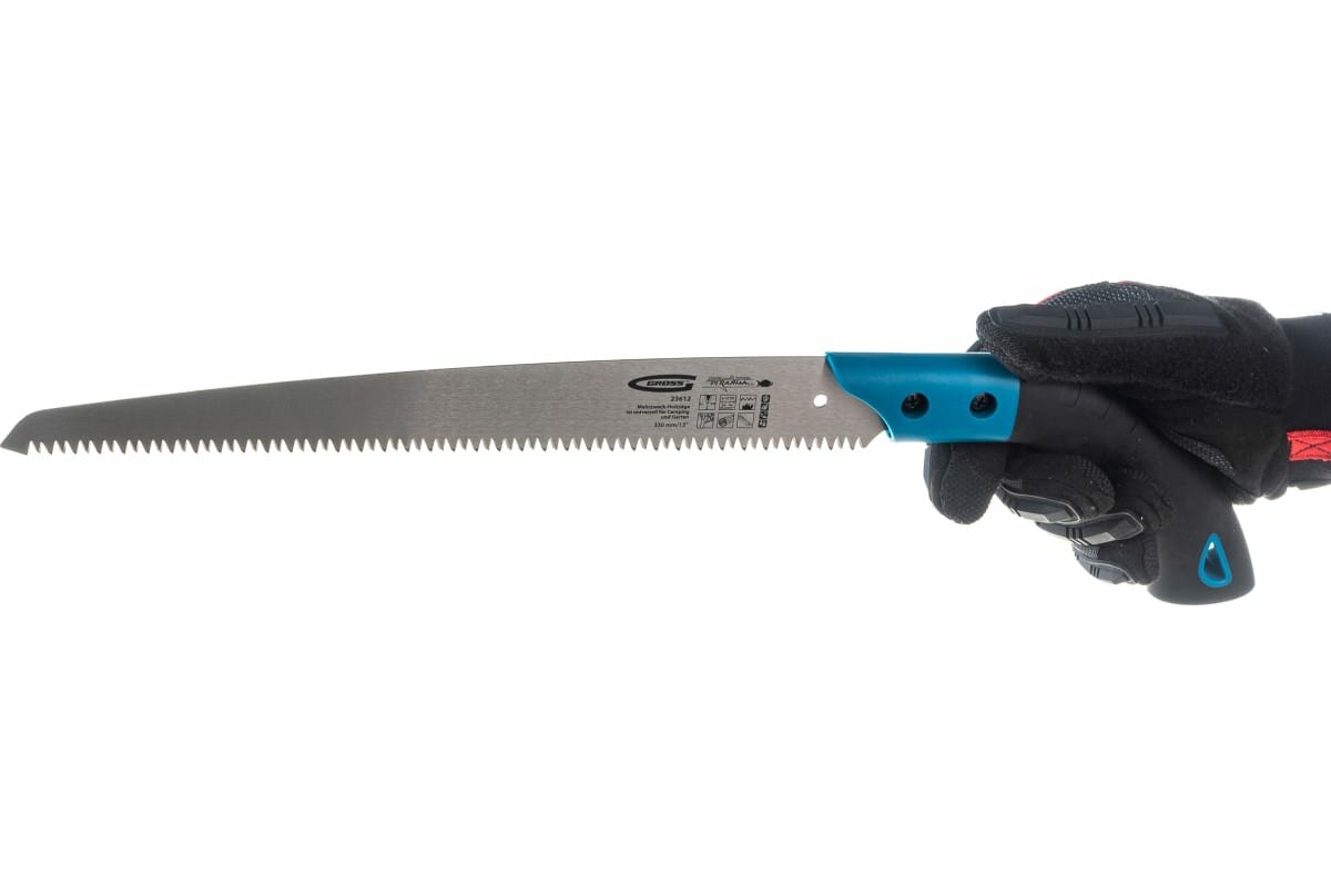 Пила по дереву Gross PIRANHA универс. для кэмп. и сада, 330 мм, 9-10TPI, зуб3D, кал. зуб, 2-ком. рук, пенал 23612