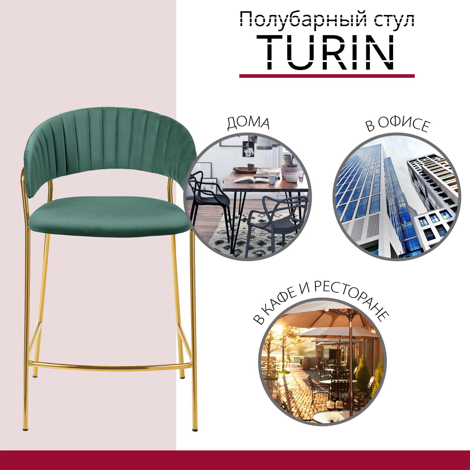 Стул полубарный Turin винный с золотыми ножками / Барный стул для дома / Стул кухонный мягкий со спинкой / Стул велюр / Стулья барные для кухни мягкие