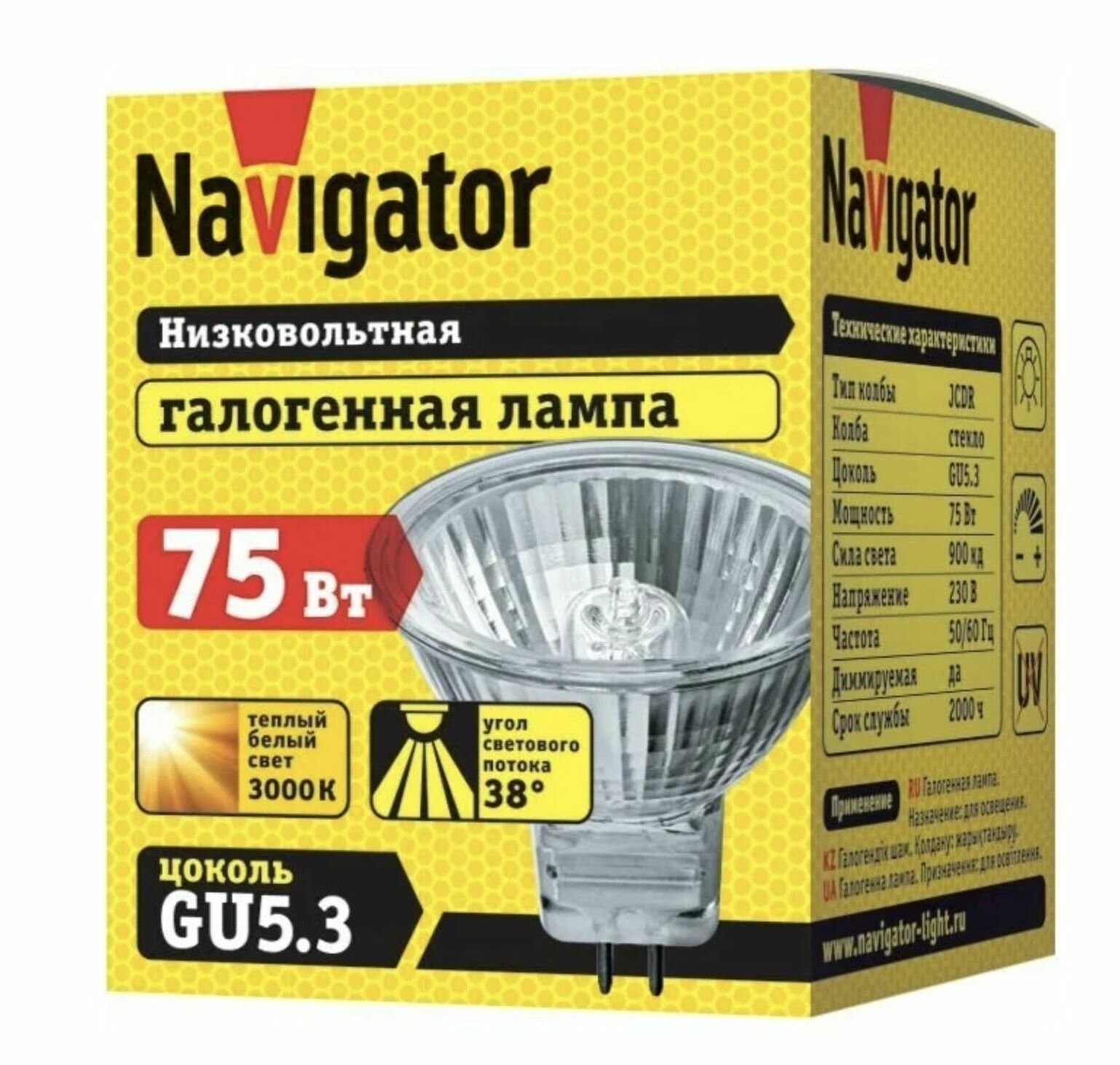 (1 шт.) Галогенная лампочка Navigator PAR, мощность 75 Вт, напряжение питания 220 В, цветовая температура 3000 K, тёплый белый свет, цоколь GU5.3, диммируемая, размер 51х50 мм