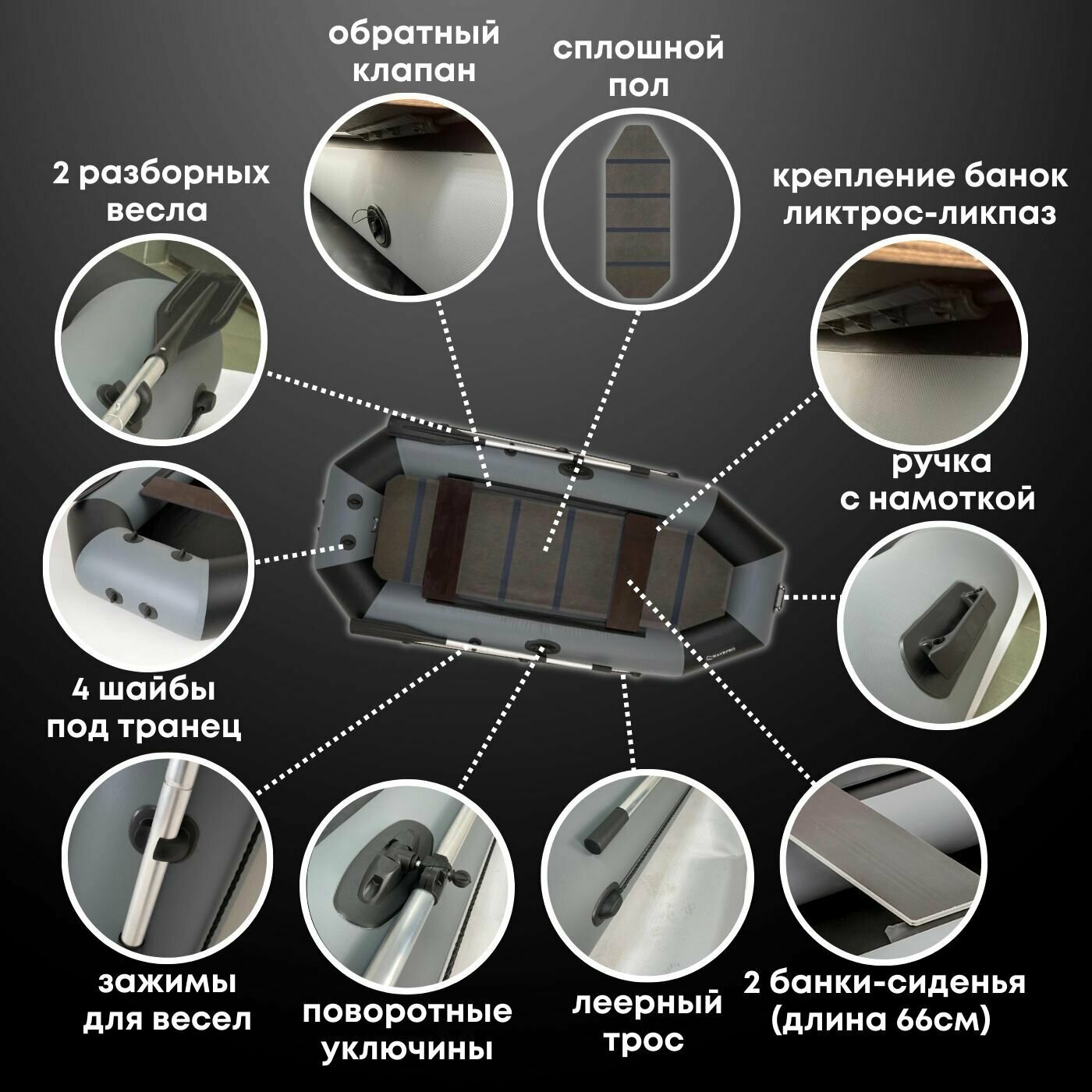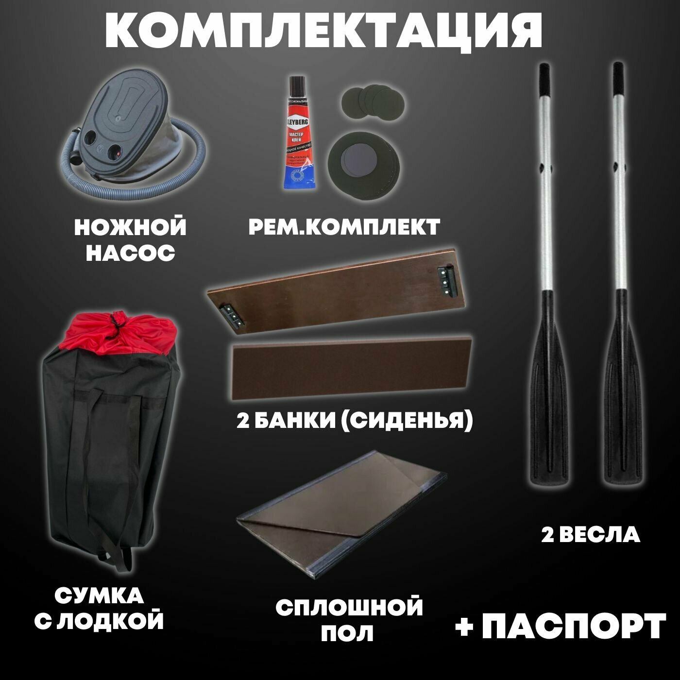| Комплектация | весла, жесткое сиденье, леерный трос, насос, ремкомплект, ручки для переноски, уключины |