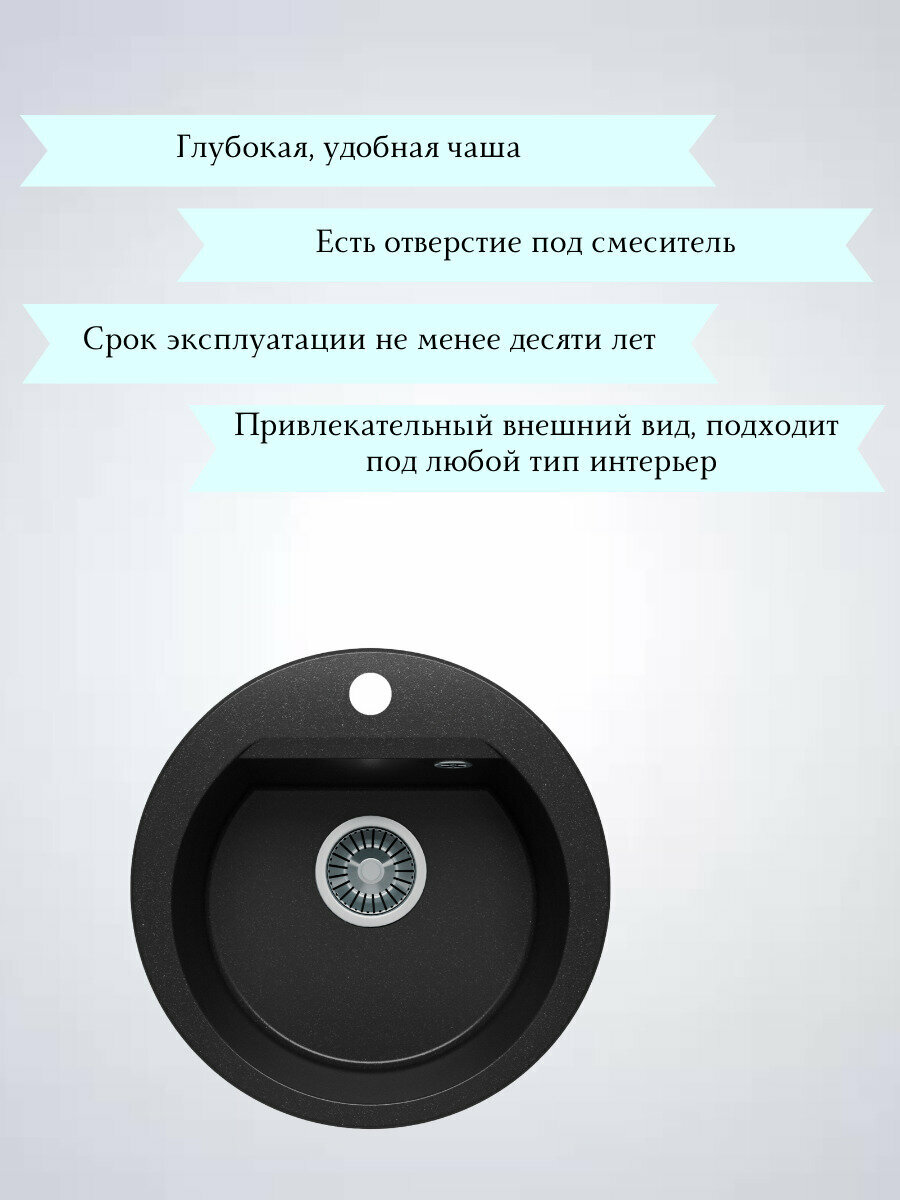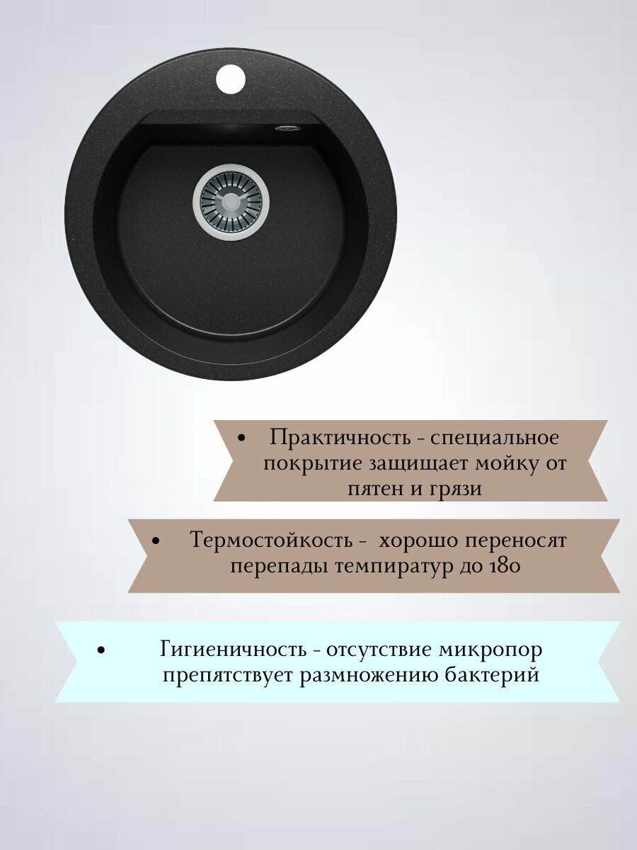 Мойка для кухни POLYGRAN ATOL-460 каменная, врезная, раковина кухонная, круглая с отверстием под смеситель (№16 Черный)