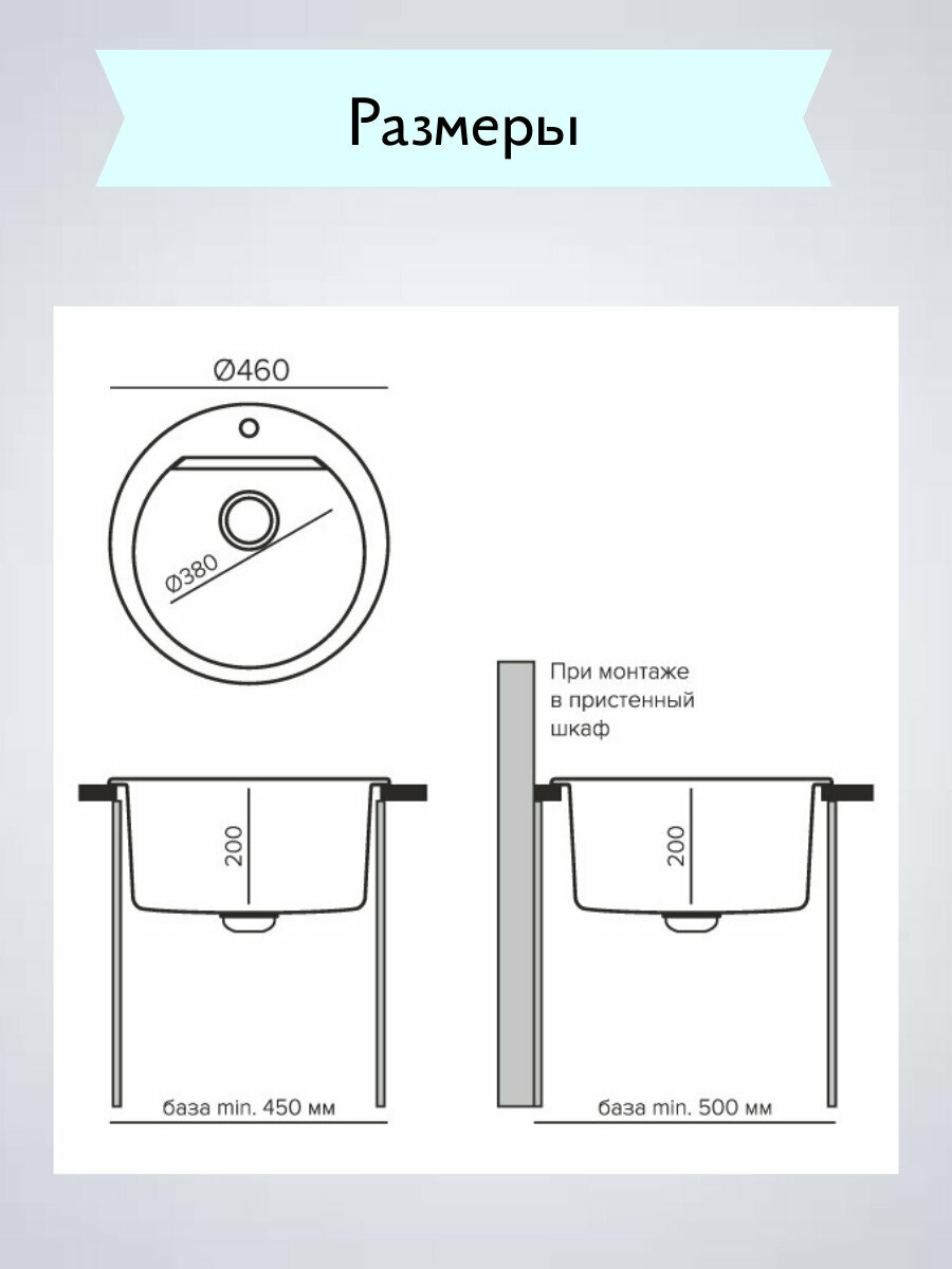 Мойка POLYGRAN, гранит-мрамор, ATOL-460, (d=460*200 мм), серый, сифон и сливная арматура в модуль 450