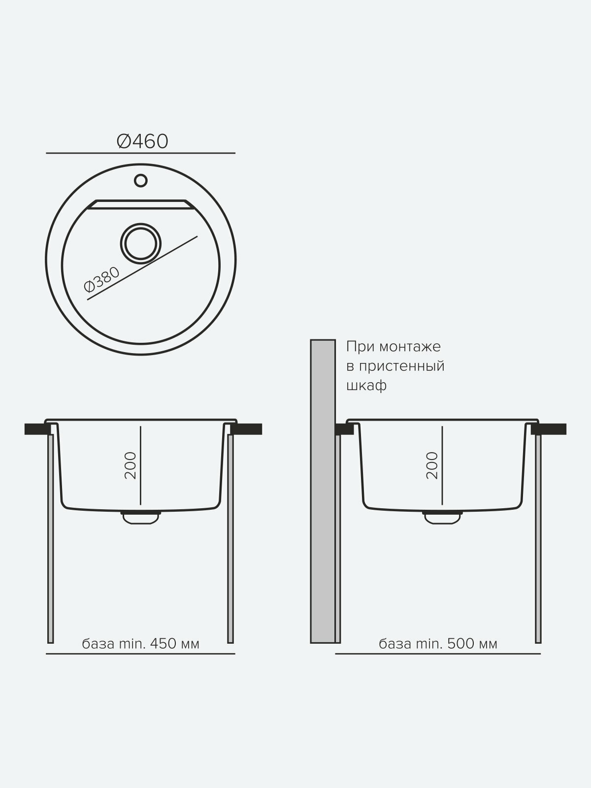 Мойка POLYGRAN, гранит-мрамор, ATOL-460, (d=460*200 мм), серый, сифон и сливная арматура в модуль 450