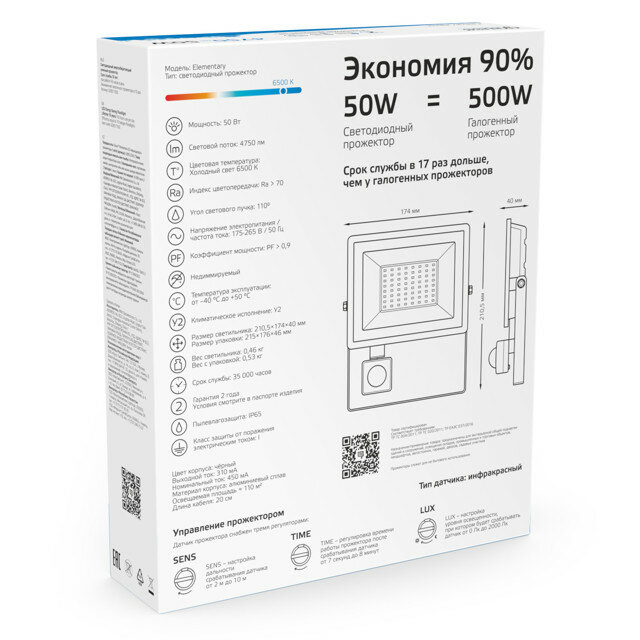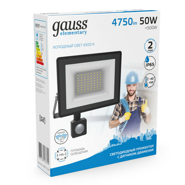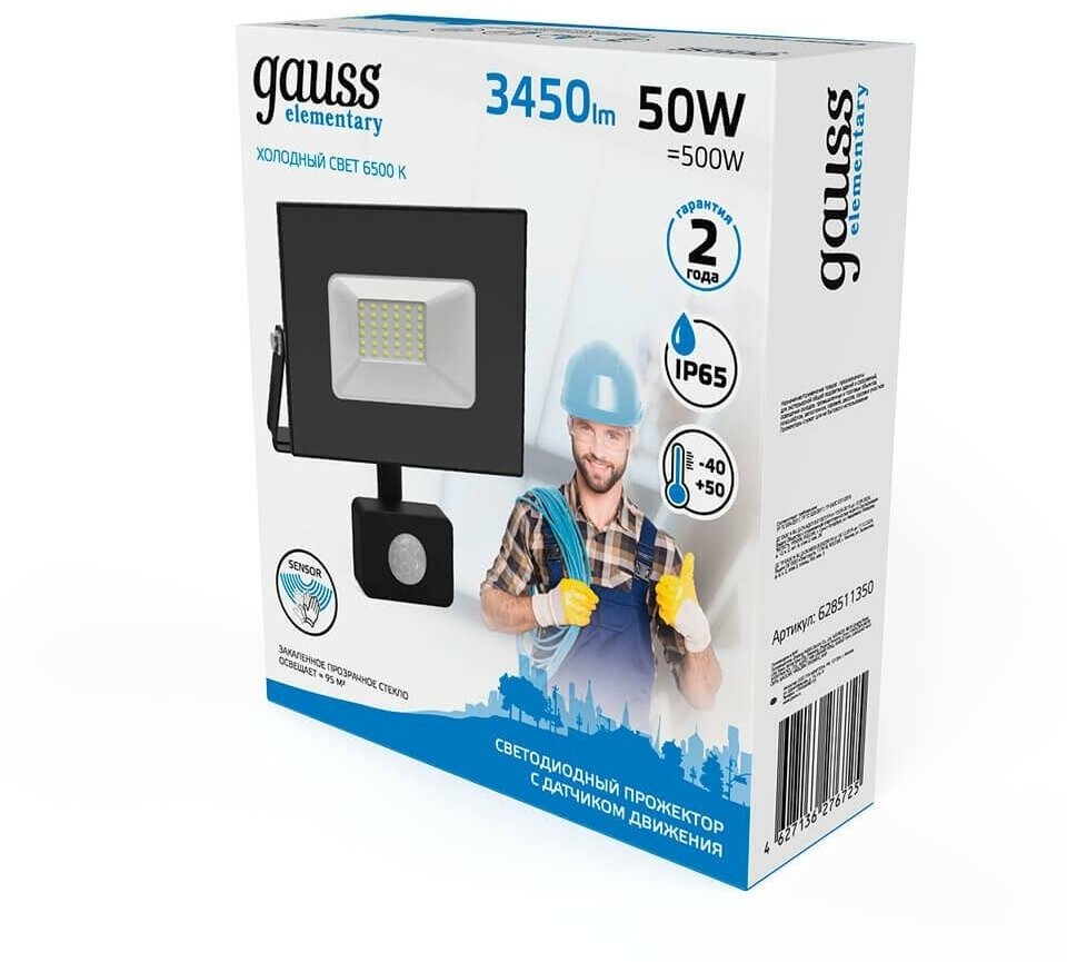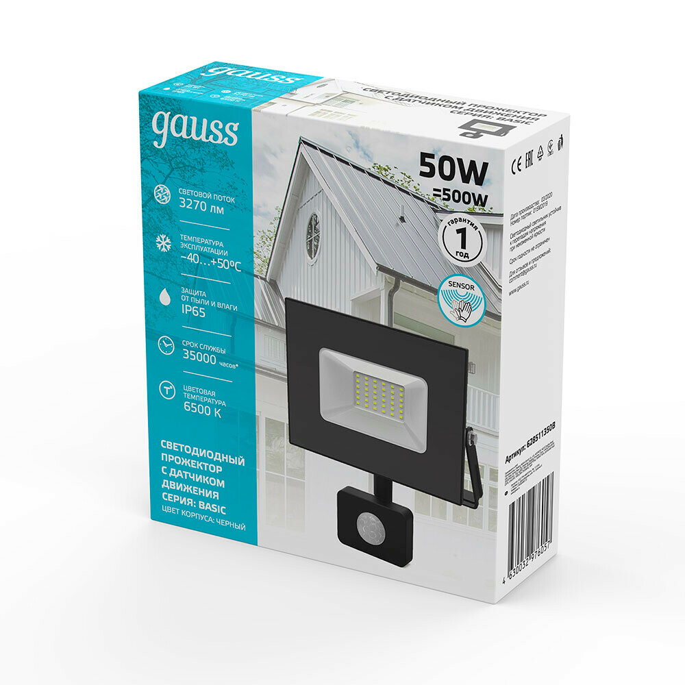 Gauss Прожектор Elementary-S 50W 3450lm 6500К 175-265V IP65 черный с датчиком движения LED (арт. 628511350)