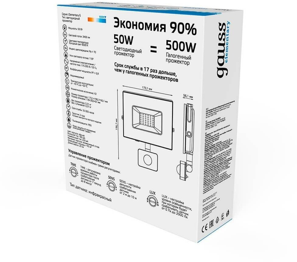 Прожектор светодиодный Elementary-S до 50Вт 6500К IP65 3450лм 175-265В датчик движения черн. GAUSS 6