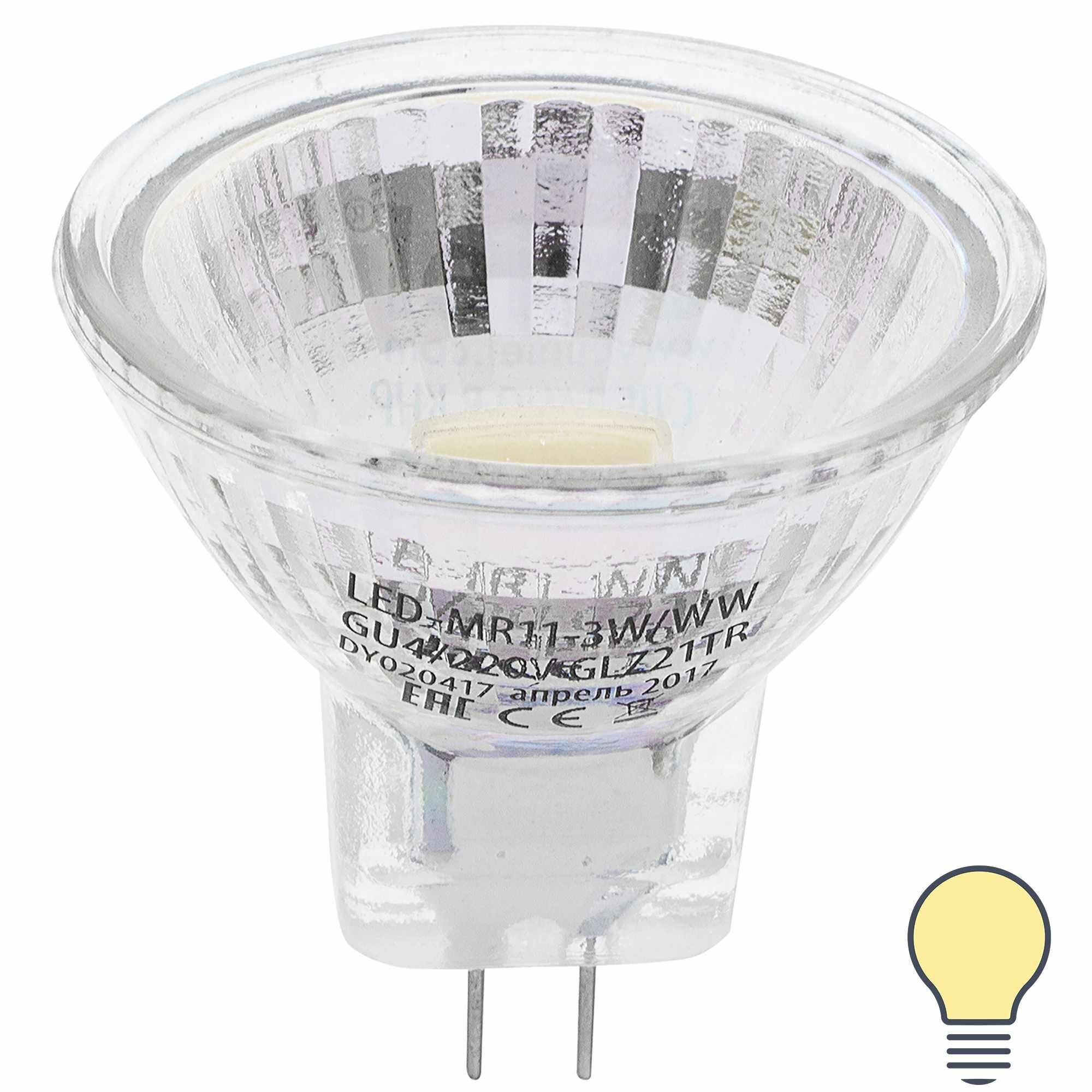 Лампа светодиодная Led-mr11-3w/ww/gu4/220v Glz21tr 220V. Прозрачная. Теплый белый свет (3000k). Карт