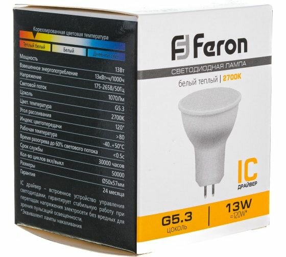 Ниже Вы можете прочитать отзывы на Лампа светодиодная Feron G5.3 13W 2700K рефлекторная LB-960 38188, ознакомится с подробными характеристиками, посмотреть интересные обзоры и фотографии на Лампа светодиодная Feron G5.3 13W 2700K рефлекторная LB-960 38188.
