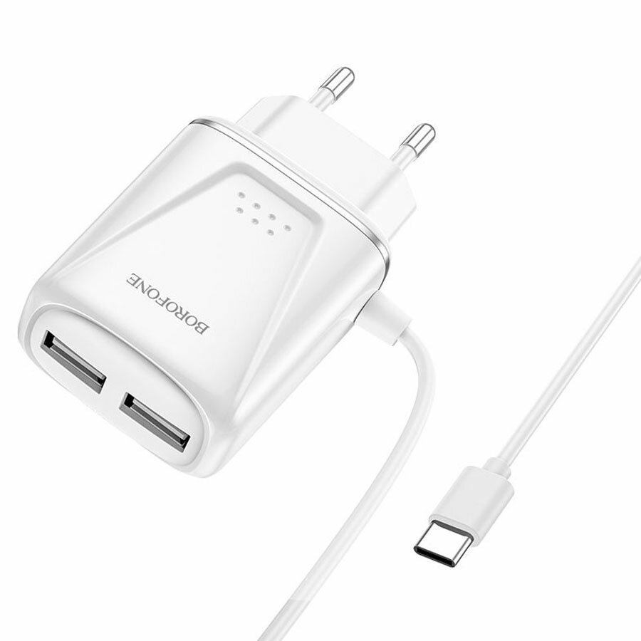 Купить Сетевое зарядное устройство BOROFONE BA50A Beneficence 2xUSB с Кабелем Type-C, 2.1A, белый
