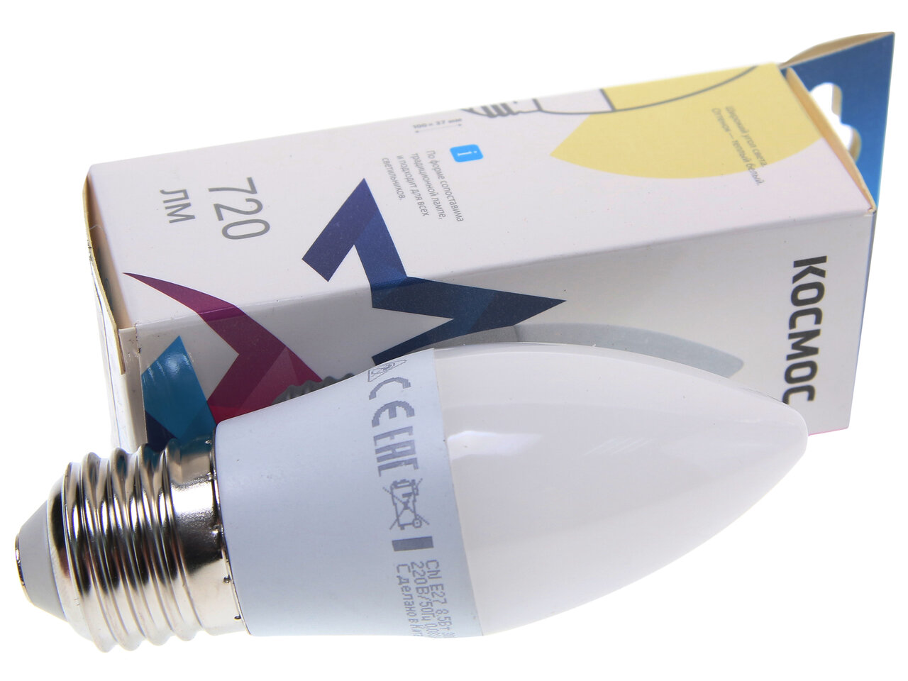 Светодиодная лампа Космос, свеча, 8.5 Вт, E27, 3000 K, LED8.5wCNE2730, теплый белый