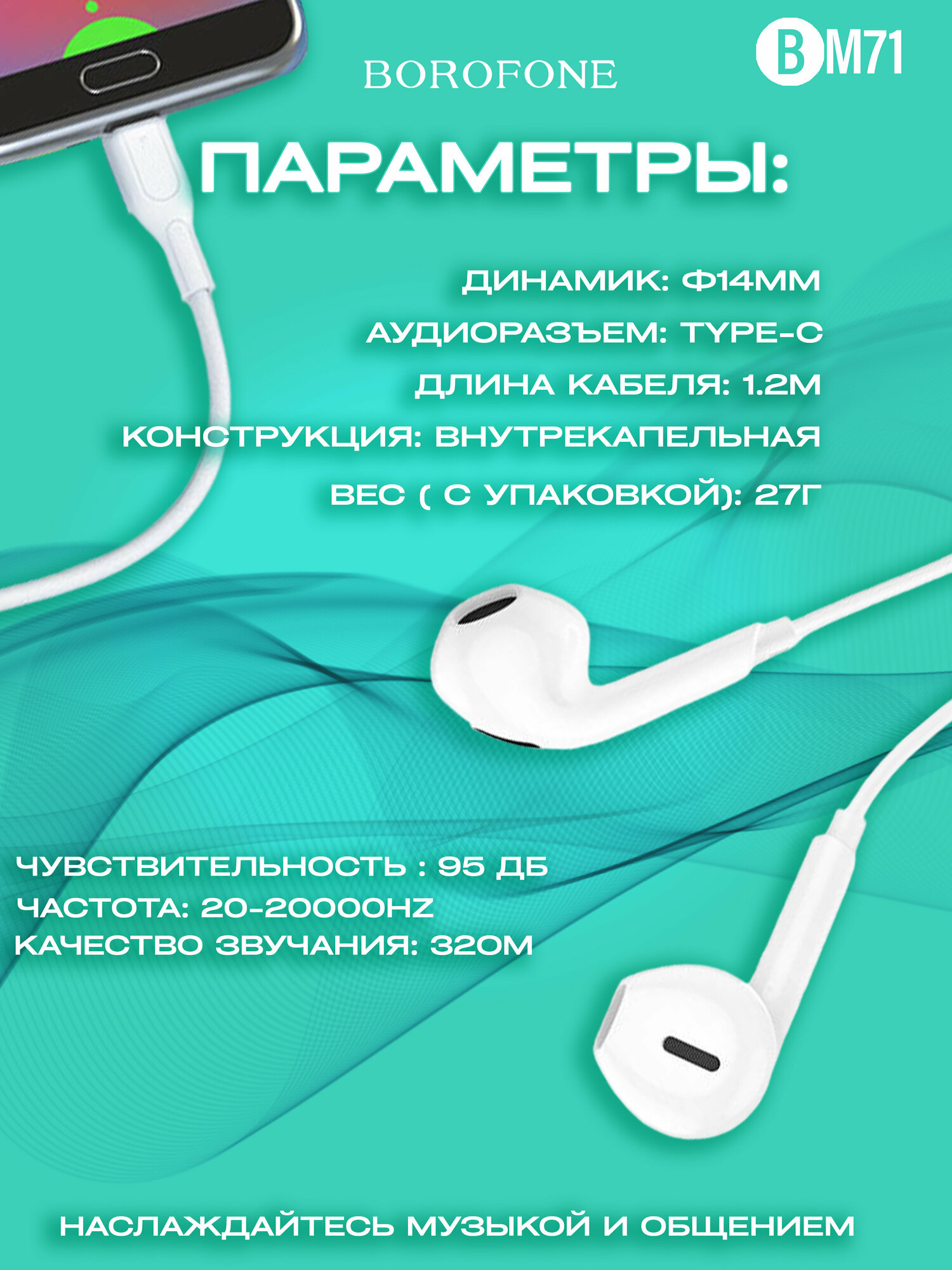 Наушники внутриканальные Borofone BM71, Light song, Type-C, 1.2 м, цвет: белый