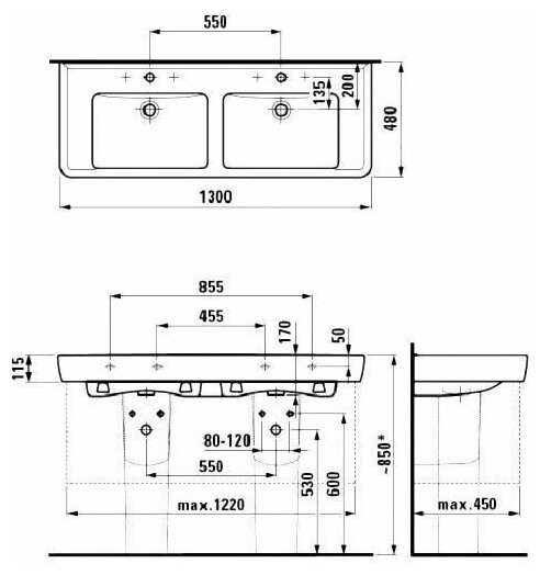 LAUFEN PRO S Раковина двойная 1300x480х115 мм , с 1 отв под смесит, цвет белый глянцевый (Со склада продаем с базой 4.8308.2.095.485.R)