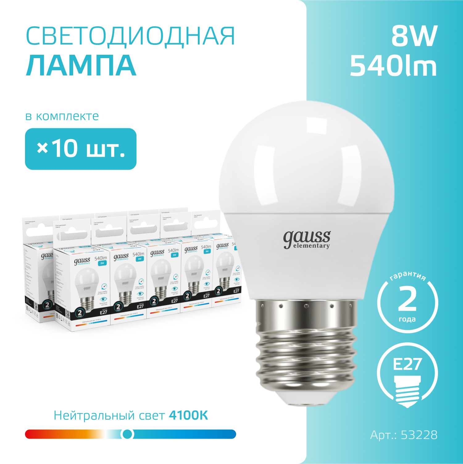 Лампочка светодиодная E27 Шар 8W нейтральный белый свет 4100К упаковка 10 шт. Gauss Elementary