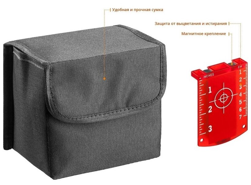 | Минусы: | Луч "отвеса" вниз, при установке на штатив - на полу не виден (мешает монтажная площадка). |