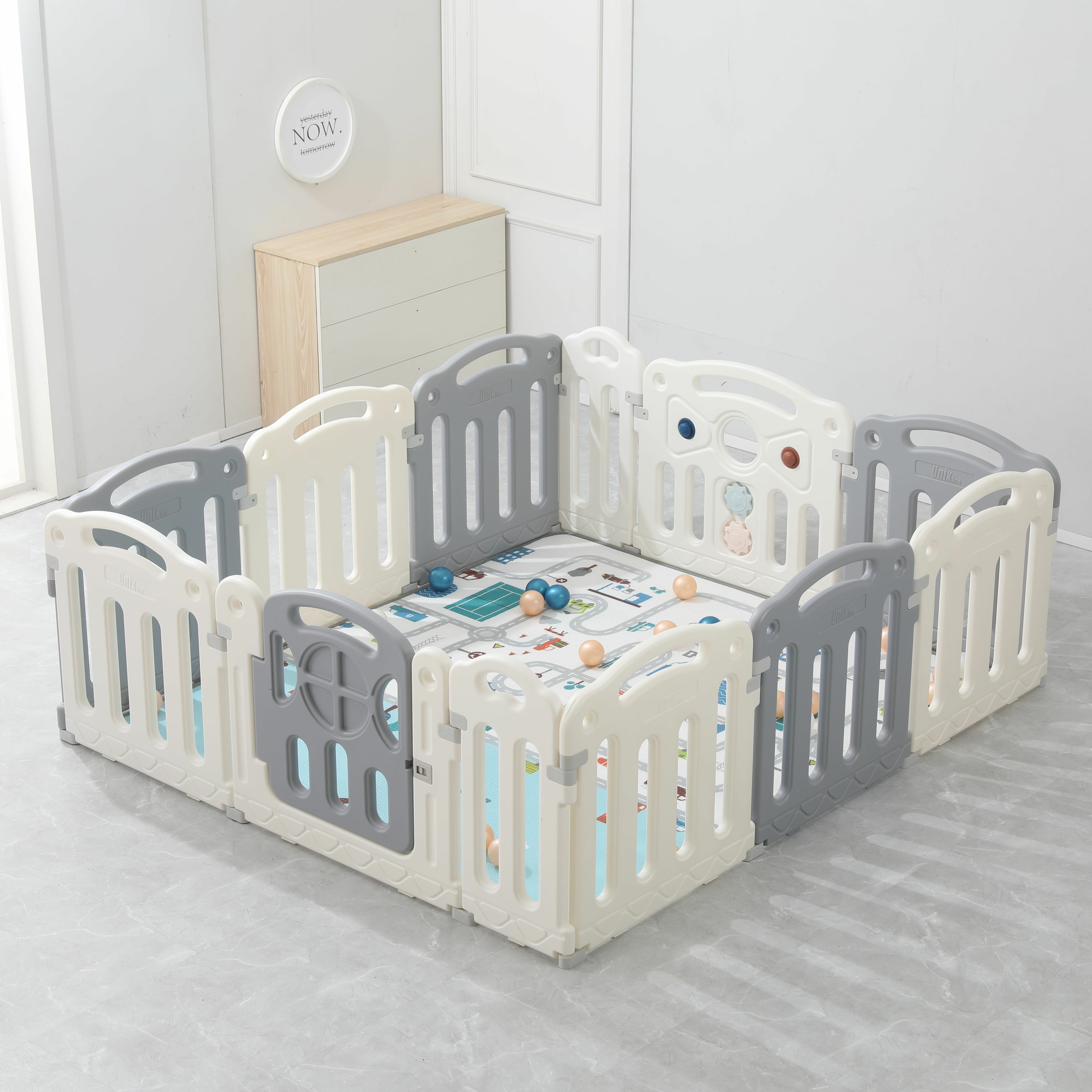 Манеж UNIX Kids "Classic" Grey, серый/белый, 160x180 см, большой детский игровой манеж с ковриком для дома и улицы, для мальчиков