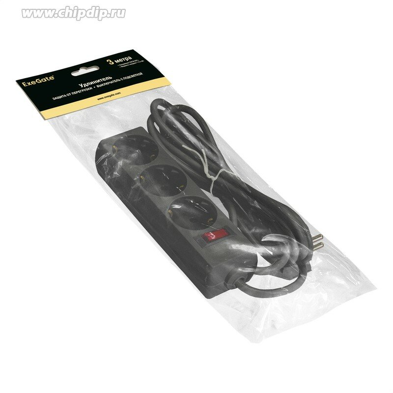 Удлинитель ExeGate EC-3-3B (3 евророзетки с заземлением, 3м, защита от перегрузки, выключатель с подсветкой, черный)