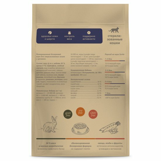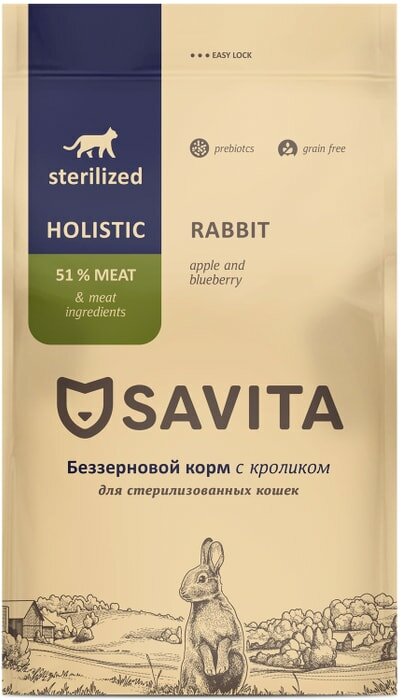 Корм SAVITA беззерновой корм для стерилизованных кошек с кроликом (2 кг)