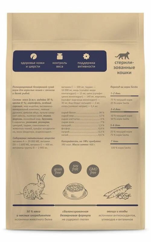 Беззерновой корм SAVITA для стерилизованных кошек с кроликом, GRAIN FREE STERILIZED, Rabbit, 400г