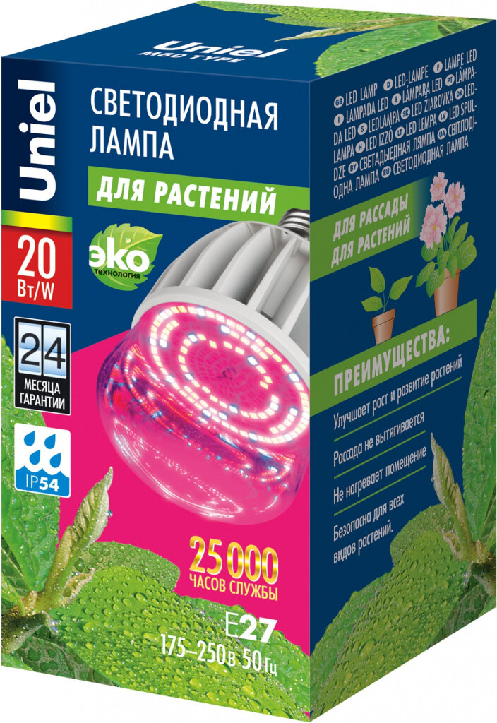 Лампа светодиодная для растений Uniel ALS55WH, E27, M80, 20Вт