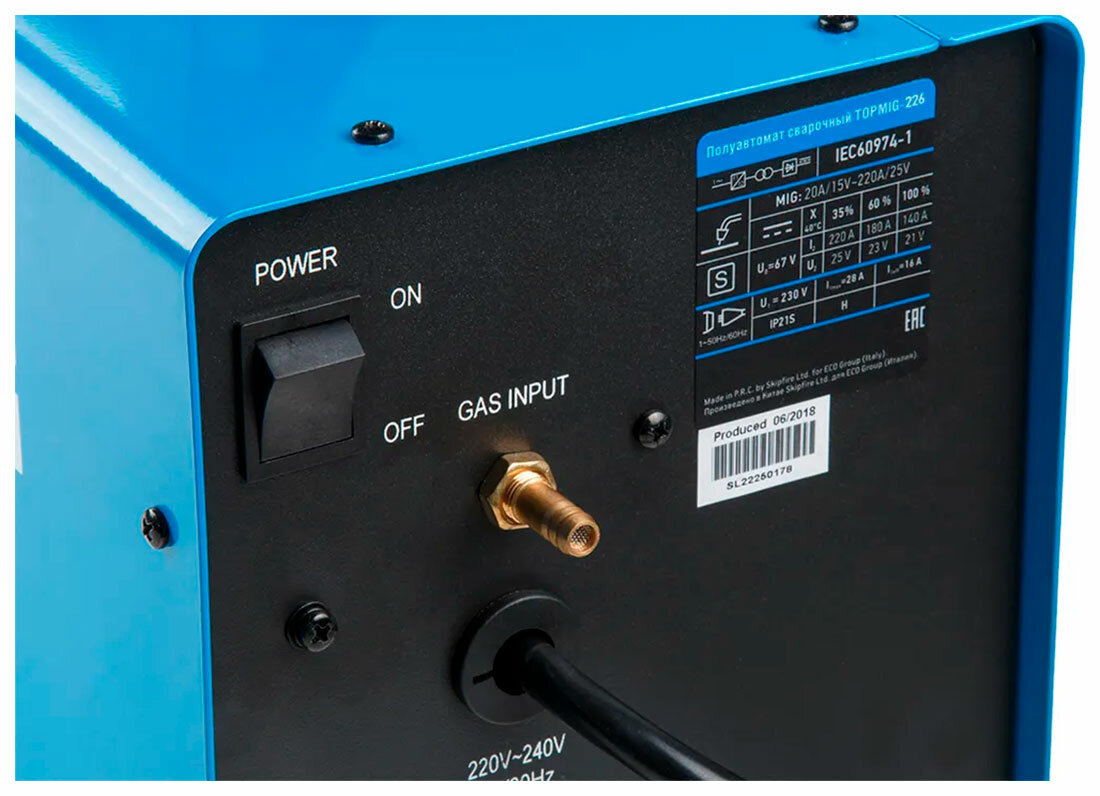 | Дополнительная информация | максимальный допустимый ток на входе 28 А; оснащен евроразъемом для горелки, возможностью смены полярности для сварки проволокой без газа (FLUX) |