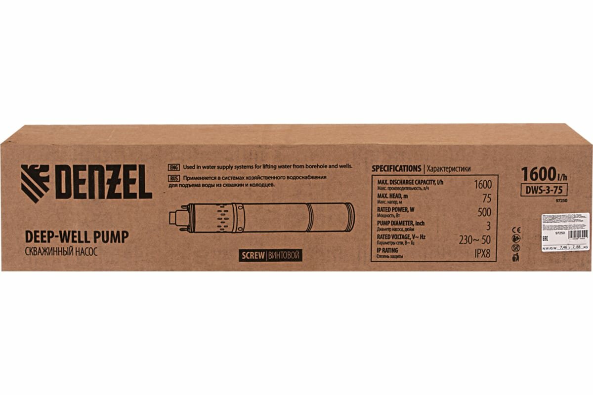 Купить Скважинный насос DWS-3-75, винтовой, диаметр 3", 500 Вт, 1600 л/ч, напор 75 м// Denzel