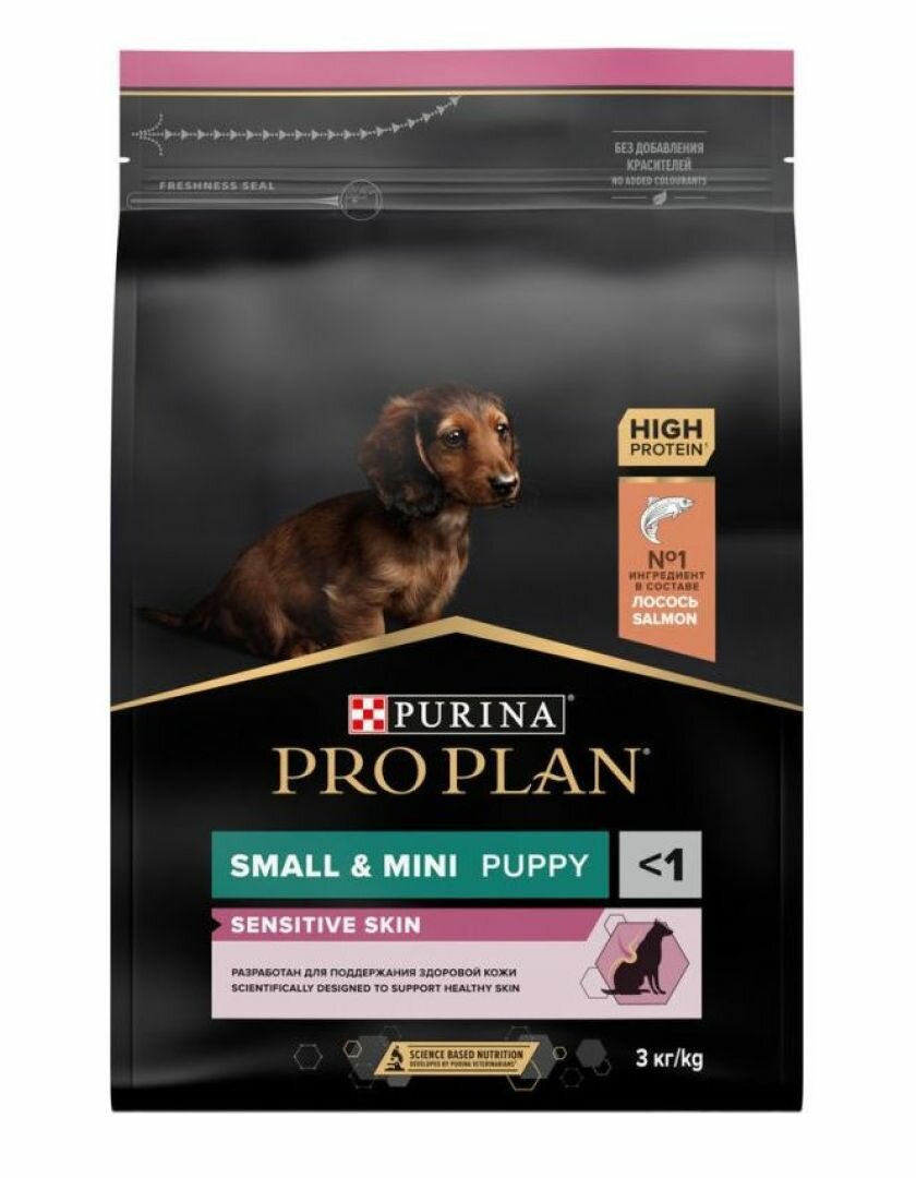 Сухой корм Pro Plan для щенков мелких и карликовых пород с чувствительной кожей с комплексом OPTIDERMA® с лососем и рисом, Пакет, 3 кг,Для щенков