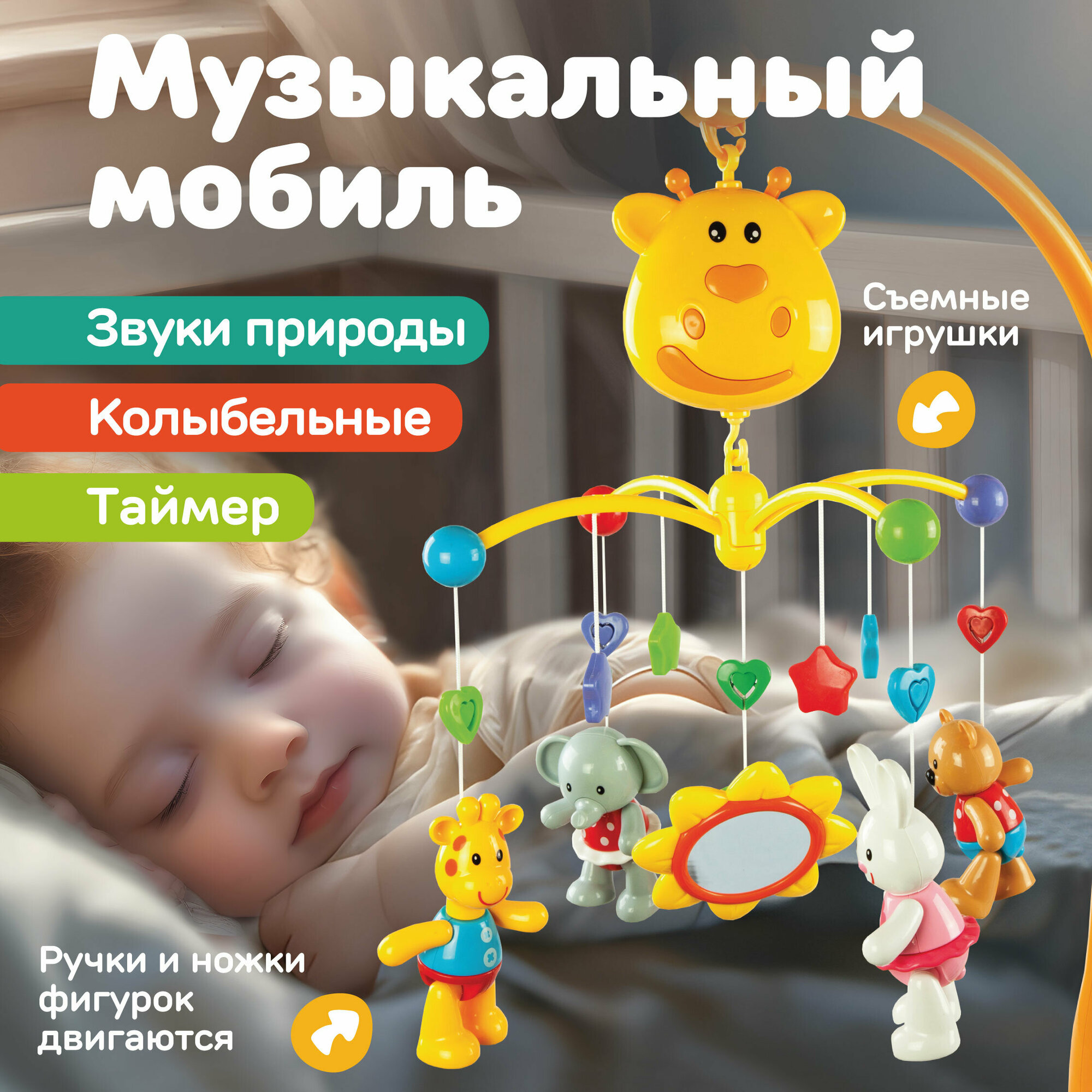 Мобиль в кроватку музыкальный «Жирафик и друзья», на батарейках